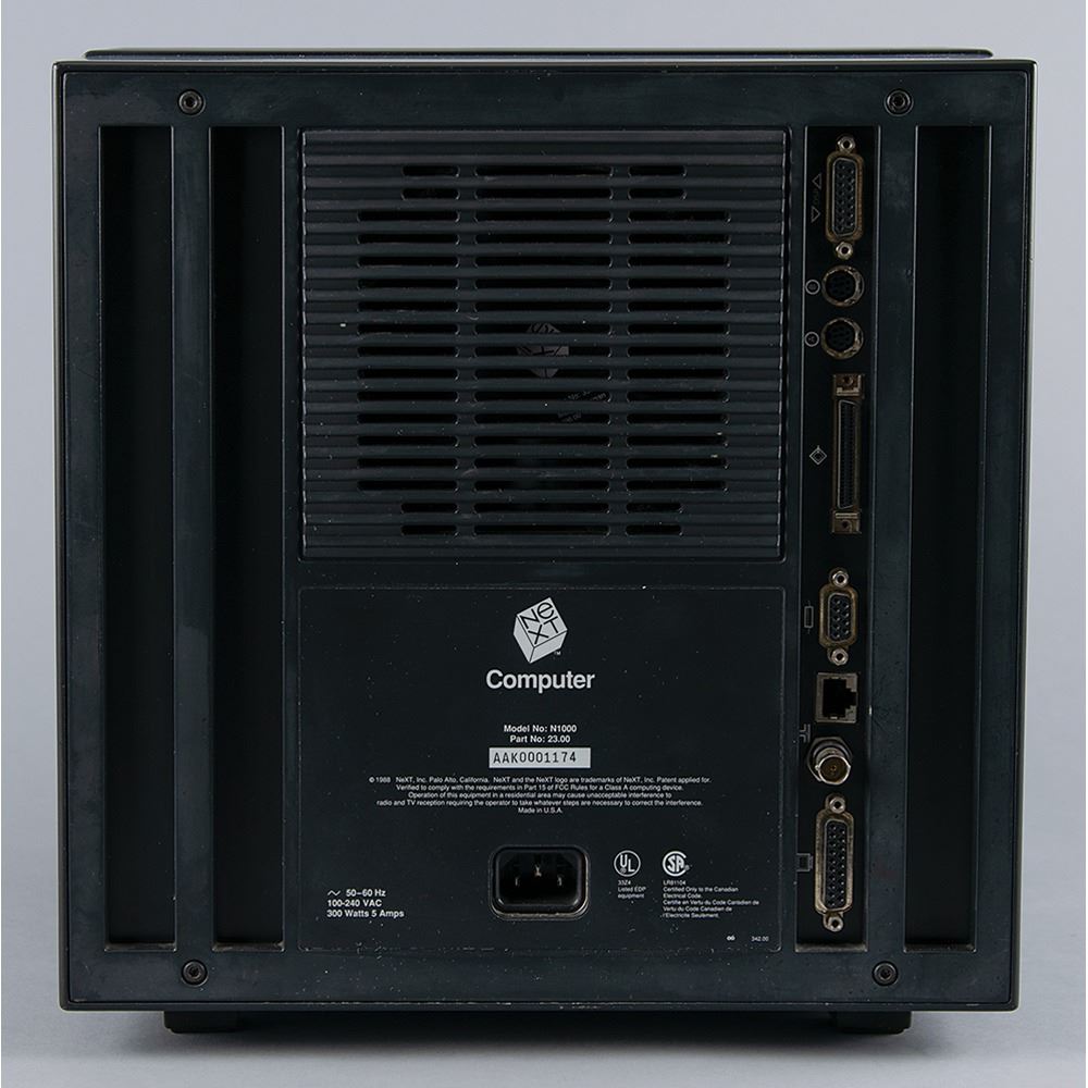 Extremely rare early production model of the NeXT Computer released by NeXT Inc. in October 1988. Informally referred to as the ‘Cube,’ the computer consists of a sturdy 1-foot die-cast magnesium cube-shaped black case, the back of which contains the Model No. “N1000,” the Part No. “23.00,” and the Serial No. “AAK0001174"; both the front and the back feature graphic design artist Paul Rand’s now-iconic company logo. The company's first and flagship product, the NeXT computer was sold at a price of $6,500 and was aimed specifically at the higher-education market, with this particular computer deriving from Cornell University in Ithaca, New York. The Cube’s impressive system specifications include a Motorola 68030 CPU, a Motorola 68882 floating-point coprocessor with a clock speed of 25 MHz, an on-board Motorola 56001 digital signal processor, two custom VLSI chips to manage the I/O subsystems, four NuBus expansion slots, a 200W system power supply, and the first commercially available read/write magneto-optical drive for data storage. Includes the power cord and original gray cover.