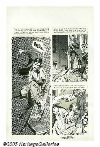<B>Neal Adams - His Name Is Savage #2 Unpublished Page (Adventure House Press, circa 1968).</B></I> Done at a "twice-up" size, this ultra-violent page by Neal Adams was drawn for the never-published second issue of Gil Kane's crime <I>noir</B></I> magazine <B>His Name Is Savage</B></I>. The image area of this page measures approximately 12.5" x 18". Aside from some yellowing Zipatone and a small stain at the lower left in panel three, the art is in Excellent condition, and the page was signed by Neal Adams in the bottom border.