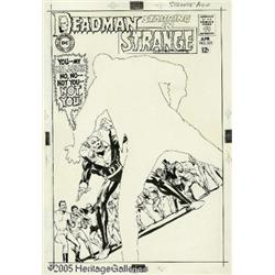 <B>Neal Adams - Strange Adventures #211 Cover Original Art (DC, 1968).</B></I> This tense confrontation scene comes from the very heart of the original Deadman run in <B>Strange Adventures</B></I>. The art paper measures 16.5" x 11.5", with an image area of 10" x 15". The condition of the art is Excellent. The title logo and other type elements are replacements and have been carefully color-matched to the art paper, adding to the eye-appeal of the cover. The cover has a paste-on art correction that was done by Neal Adams to eliminate a foreground figure's hand that was originally drawn along the left border's edge. This correction area is original art, not a stat. It is applied with such craftsmanship that a very close inspection is needed to even detect it. A rogues' gallery of Deadman's nefarious circus peers is portrayed crouching behind him. While these figures were obscured by the coloring scheme used in the printed comic book cover, here they are seen in vivid detail. Neal Adams' fine-lined inking style was at its most masterful throughout this era.