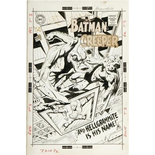 <B>Neal Adams - The Brave and the Bold #80 Cover Original Art (DC, 1968).</B></I> By this issue of <B>The Brave and the Bold</B></I>, Batman was the anchor, especially since Neal Adams was drawing it, and the new Steve Ditko creation, the Creeper, was into the third issue of his short-lived series, <B>Beware the Creeper</B></I>. Batman and the Creeper battle the freakish half-man, half-insect, Hellgrammite, is this cover illustration brought to menacing life by Neal Adams' skilled hand. It's pure Neal Adams, at his best! The art has an image area of 10" x 15". There is some glue staining, especially at the upper left corner (from a missing logo paste-up), and the attached paste-ups exhibit a bit of aging; otherwise, the condition is Very Good. This lot includes a hand-painted color guide for the cover, which has an image area of 7" x 10.25". Although the guide has some overall aging, its condition is also Very Good. <BR><BR><b>Shipping:</b> Flat Material, Small (<a target="_blank" href="http://www.heritageauctions.com/common/shipping.php">view shipping information</a>)