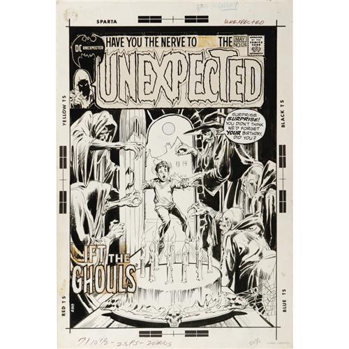 <B>Neal Adams - Unexpected #124 Cover Original Art (DC, 1971). </B></I> "It's my party and I'll shriek if I want to...." Neal Adams masterminded another chiller-diller "cover hook" for <B>Unexpected </B></I>with this scene from "Gift of the Ghouls." This cover has an image area of 10" x 15". Aside from a few missing stat/lettering elements and a few glue stains, this cover is in Very Good condition.<BR><BR><b>Shipping:</b> Flat Material, Large (<a target="_blank" href="http://www.heritageauctions.com/common/shipping.php">view shipping information</a>)