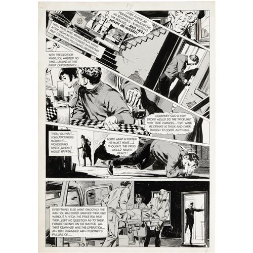 <B>Neal Adams and Steve Englehart - Vampirella #10, page 9 Original Art (Warren, 1971).</B></I> Before he became a renowned comics writer, Steve Englehart also briefly worked in comics as an artist. For the Denny O'Neil scripted chiller "The Soft, Sweet Lips of Hell," Englehart teamed with Neal Adams to turn in these finely detailed, <I>film noir </B></I>-like scenes. Englehart wrote of his early art, "I had a good sense of layout, which is to say, storytelling. When I got the chance to write, that worked better, and was better received by those editors, so I gave up on art. The sense of layout continues to serve me, in that I can imagine how I'd draw any story I write, so I don't ask for stuff that can't be done." Neal Adams enthralled Warren readers with his superb grey tone art for their horror magazines. This page has an approximate image area of 10.5" x 15", and the art is in Excellent condition.<BR><BR><b>Shipping:</b> Small Flat (<a target="_blank" href="http://www.heritageauctions.com/common/shipping.php">view shipping information</a>)