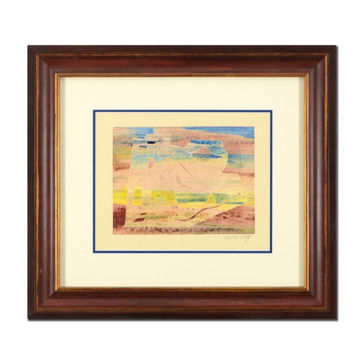 This is an original mixed media linocut on paper by Neal Doty (1941-2016), hand signed by the artist. This piece comes custom framed. Includes Certificate of Authenticity. This piece comes from Neal Doty's personal collection and was received directly from Doty's Estate. Measures approx. 26" x 23" (frame), 10" x 20" (image). Reference #: 239382