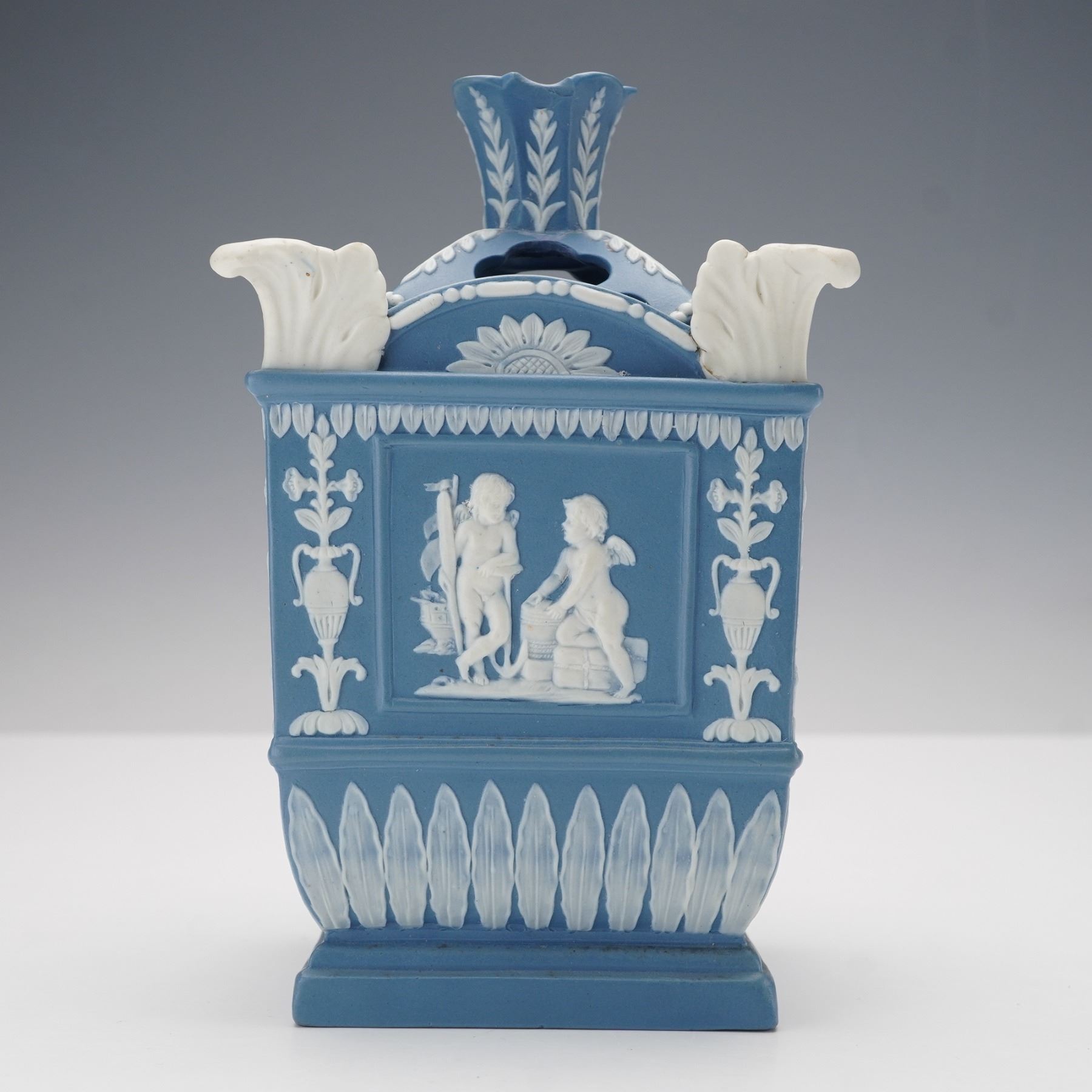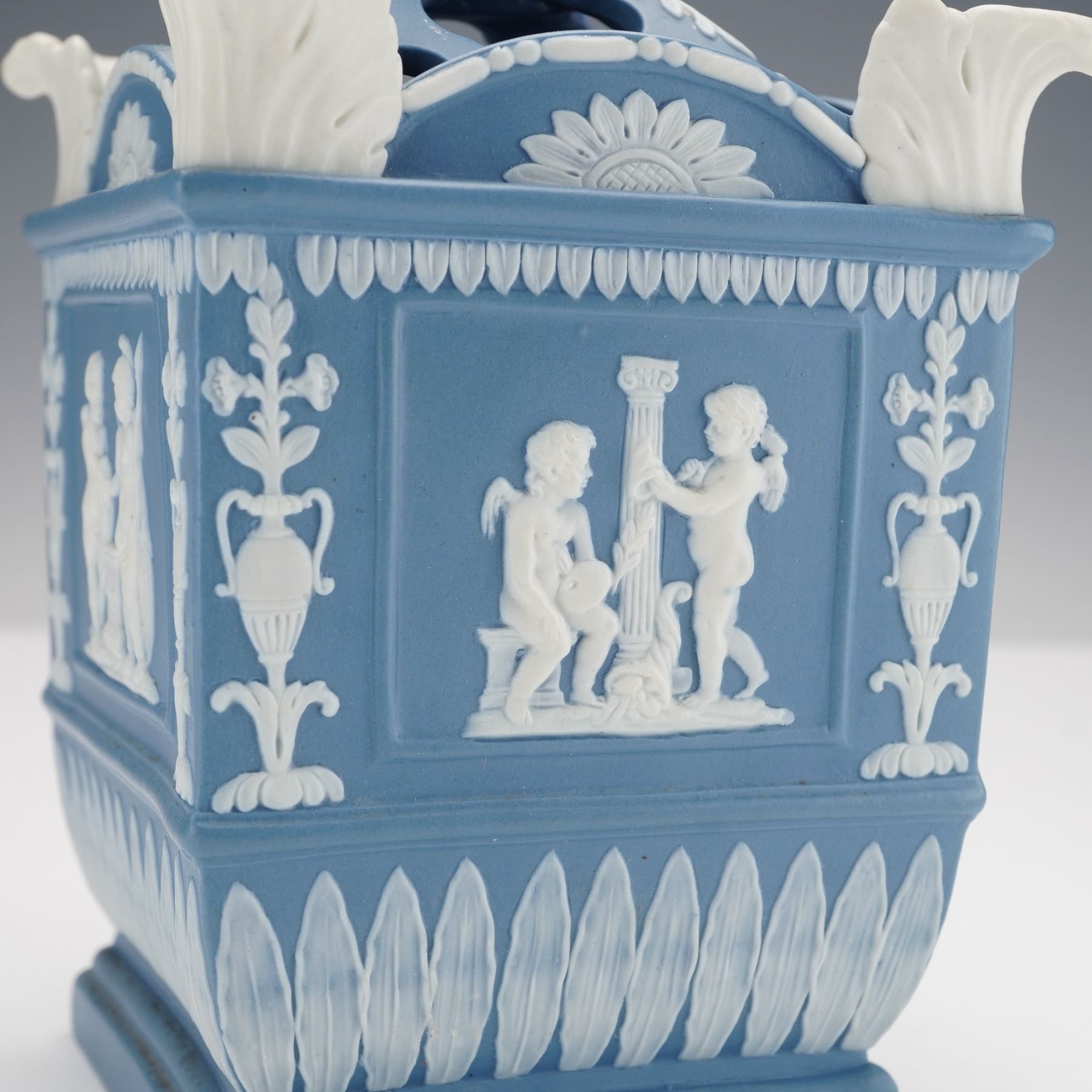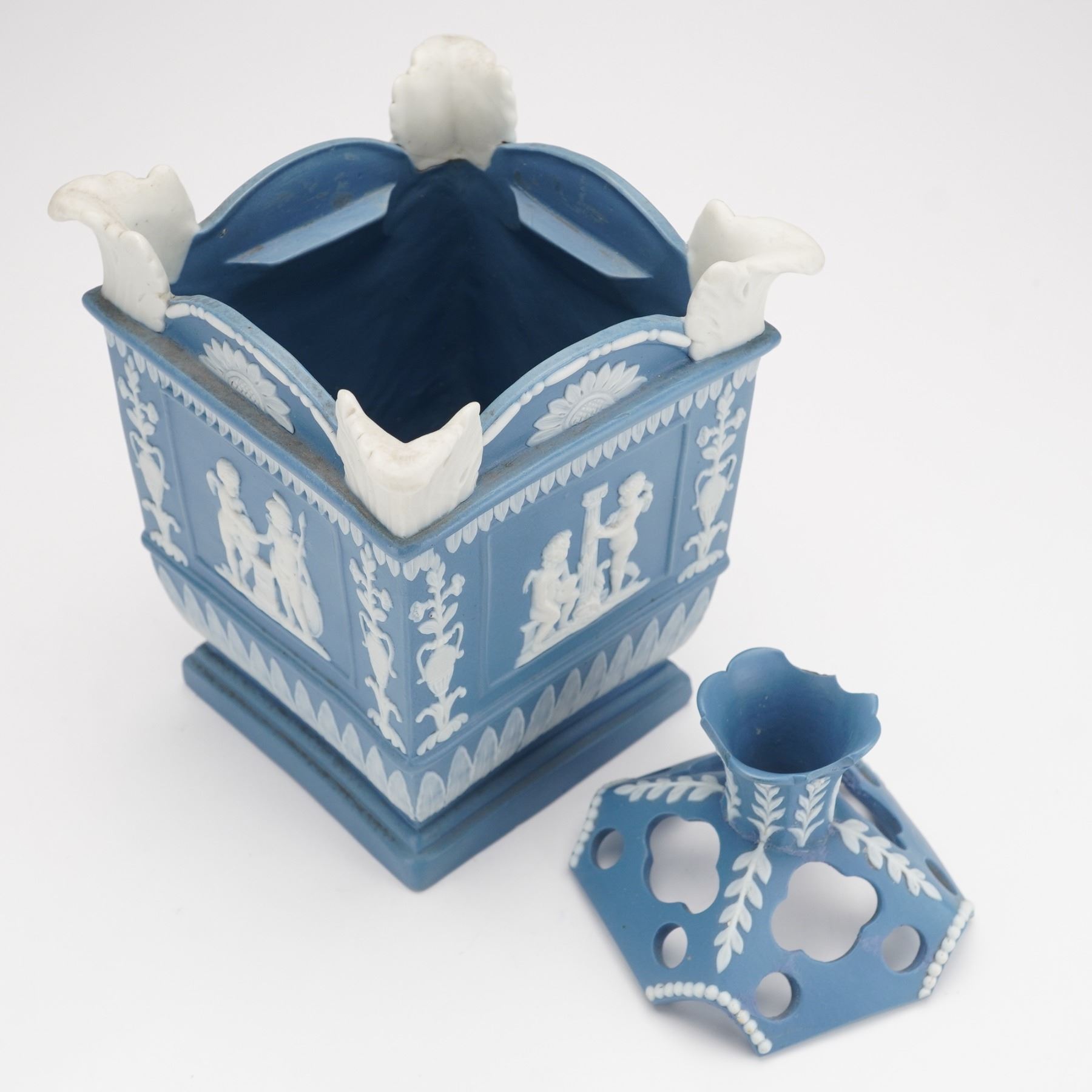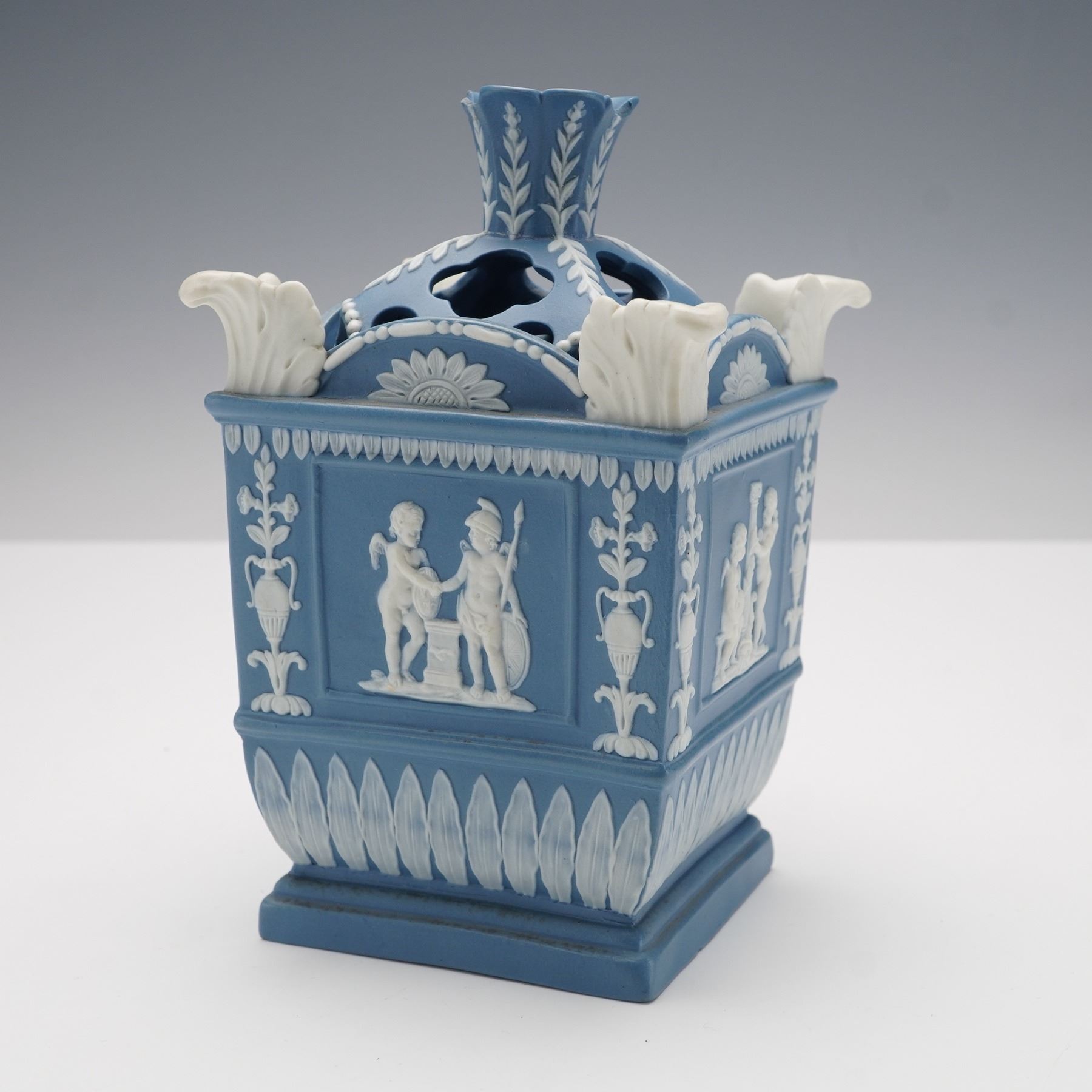 The square form features white relief decoration on all sides depicting putti symbolizing the Anglo-French commercial treaty of 1786, representing Commerce, Art and Industry, and Liberty. Classical motifs of urns, floral garlands, and leaf borders surround the figural panels, while applied white scroll ornaments accent the corners. The removable pierced cover with molded foliate designs completes the piece.