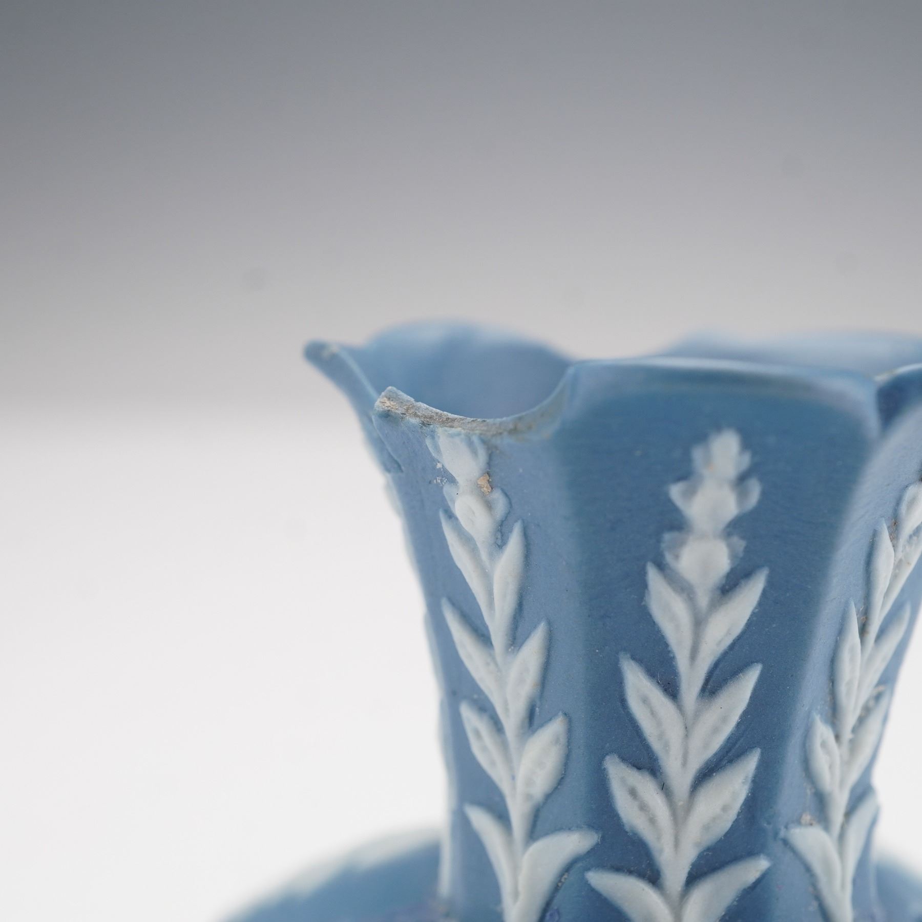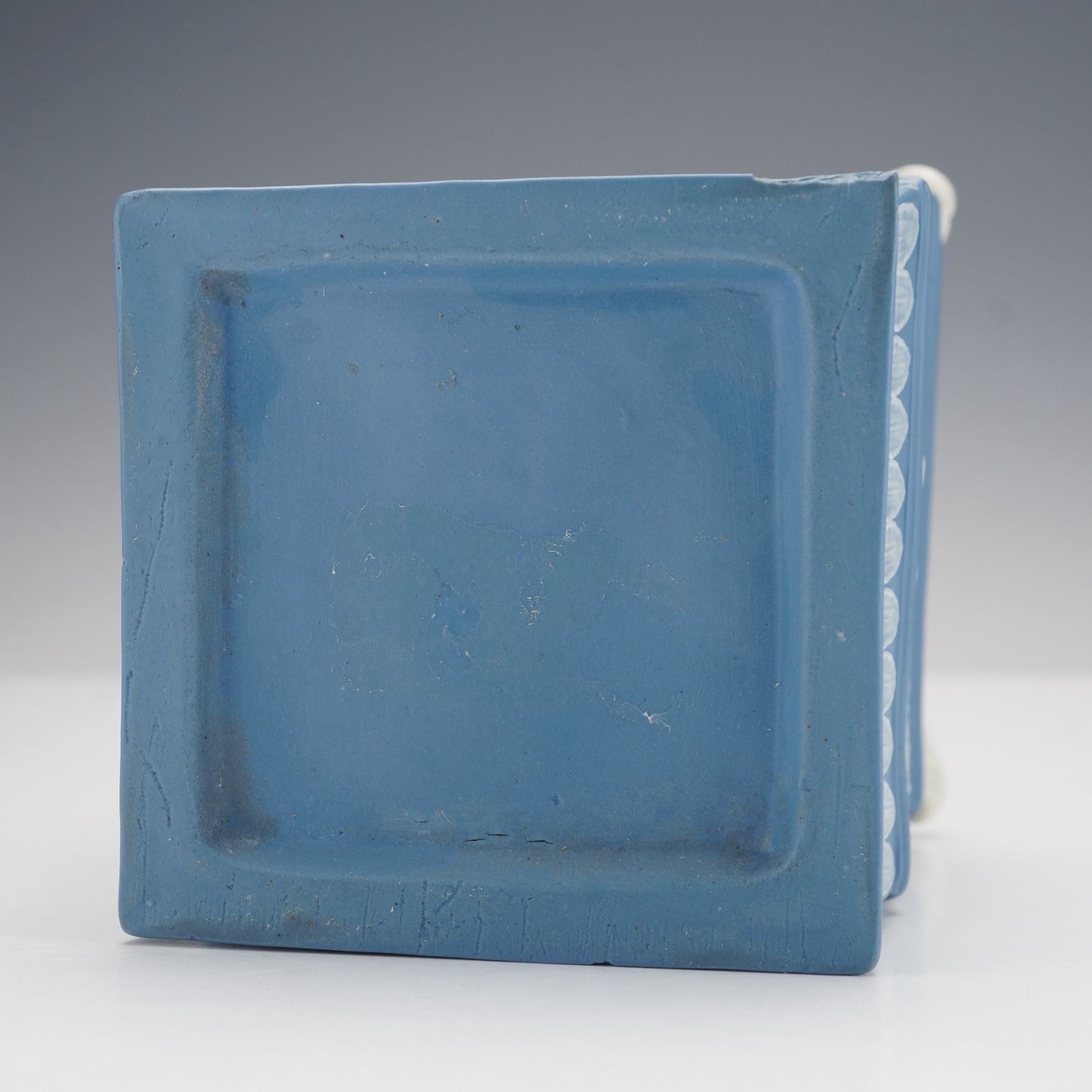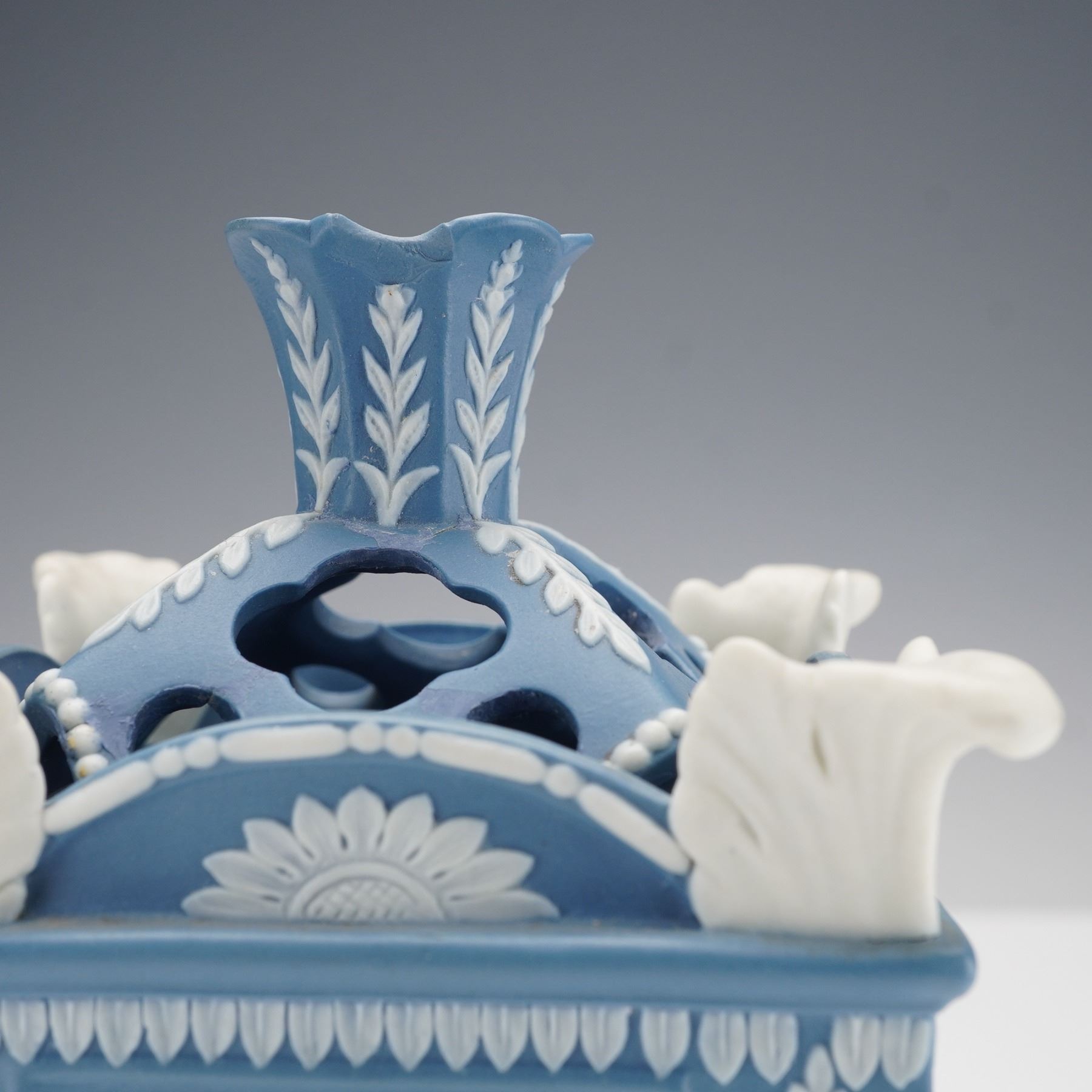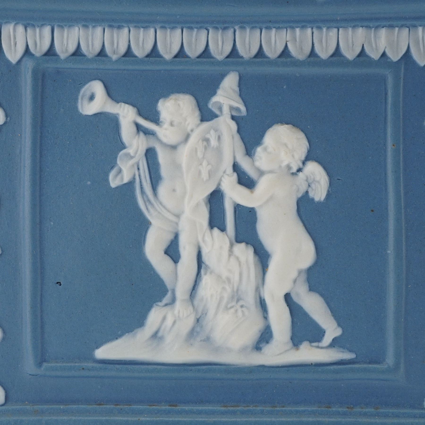 The square form features white relief decoration on all sides depicting putti symbolizing the Anglo-French commercial treaty of 1786, representing Commerce, Art and Industry, and Liberty. Classical motifs of urns, floral garlands, and leaf borders surround the figural panels, while applied white scroll ornaments accent the corners. The removable pierced cover with molded foliate designs completes the piece.
