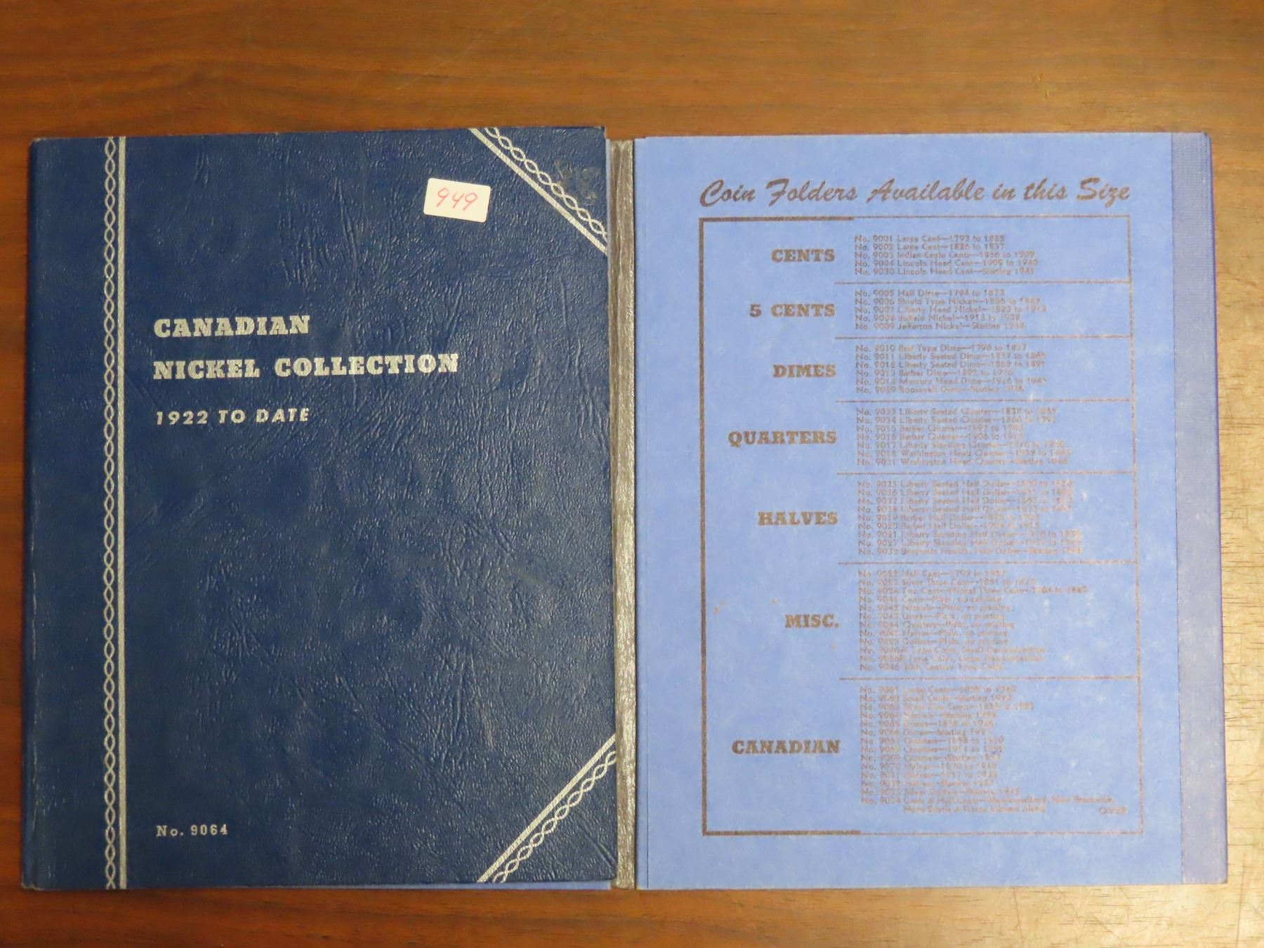 Near Complete Canadian Nickel Collection 1922 to 1960. Missing only Key Date 1925. Coins grade F-12 to AU. Housed in a blue Whitman folder.