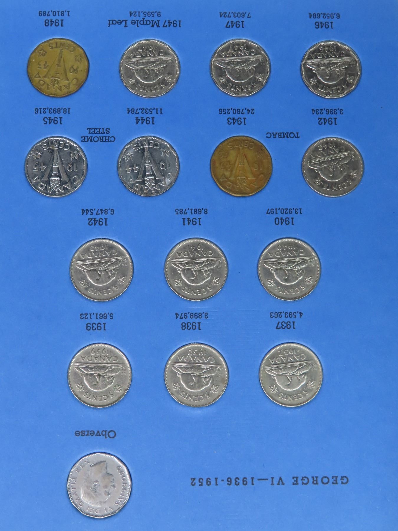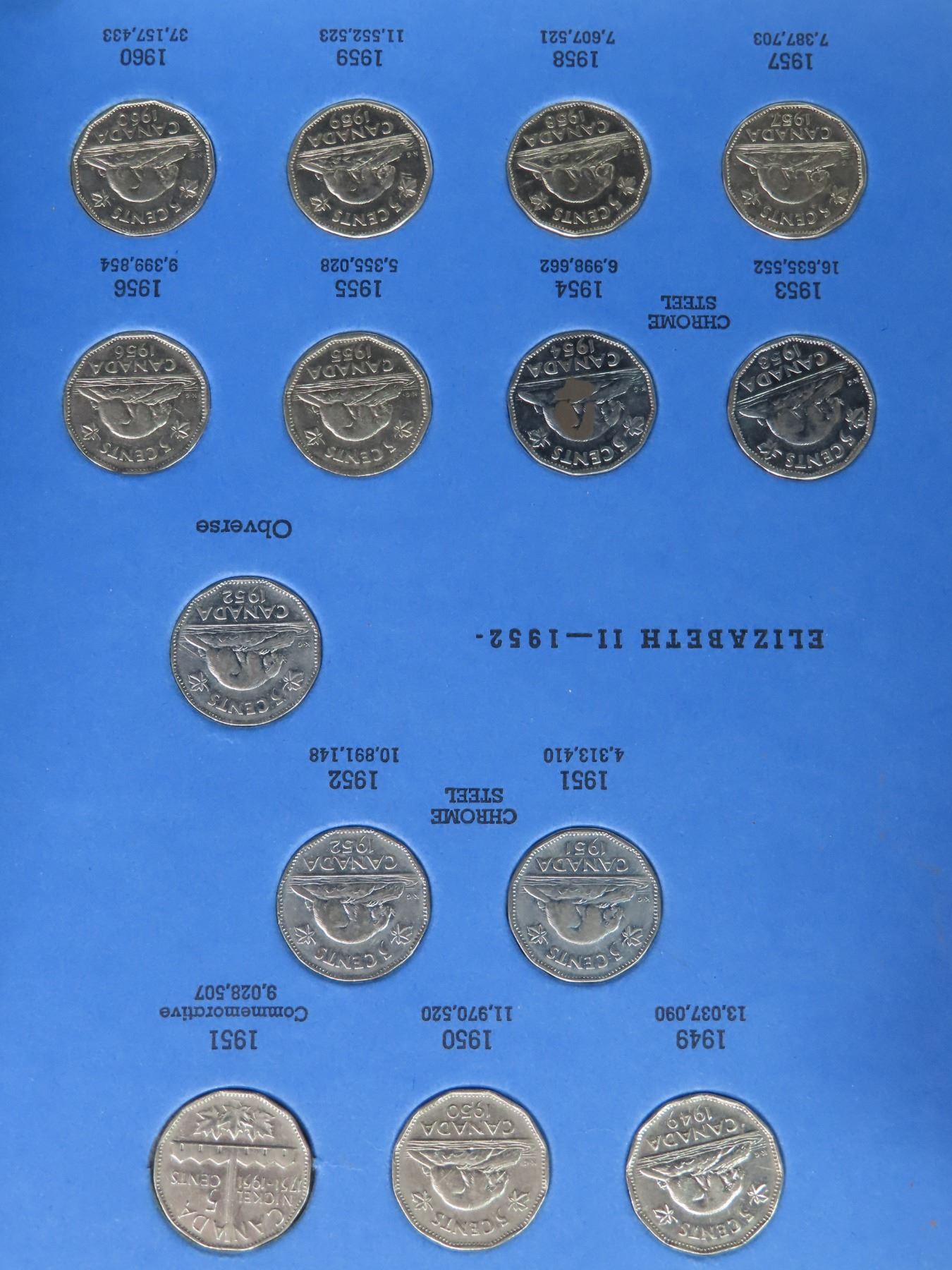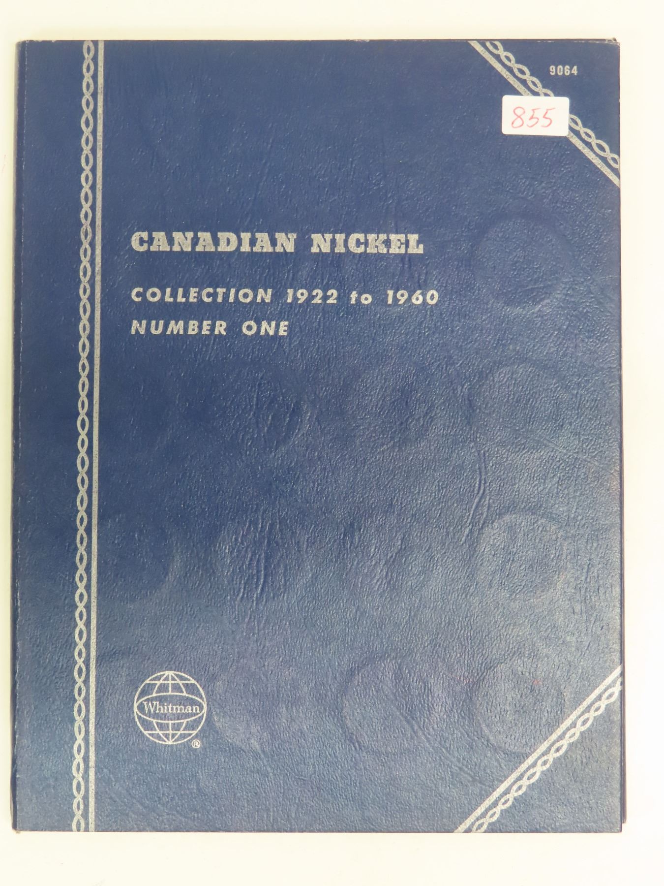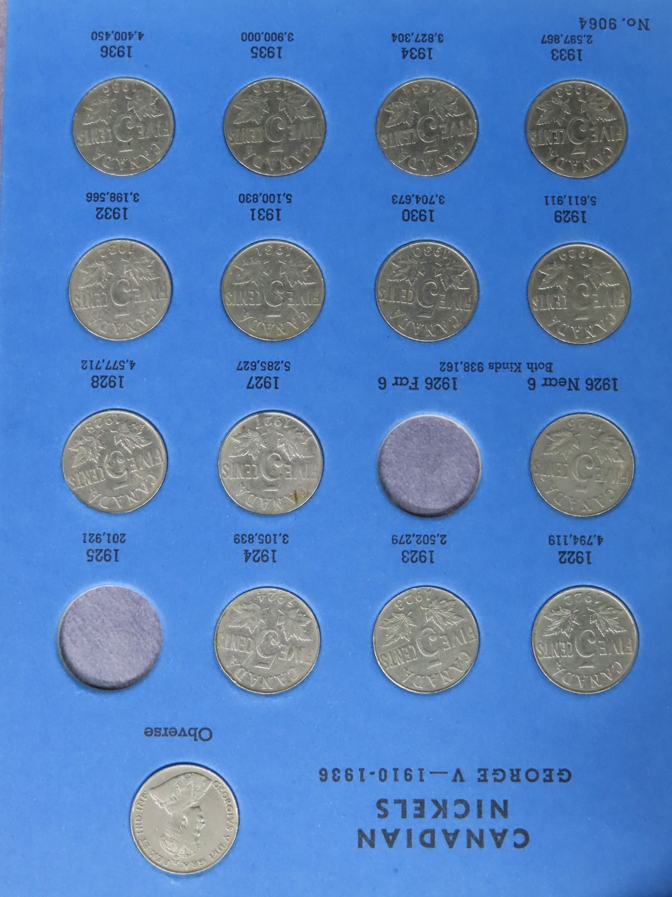 Near Complete Collection of Canadian Nickel 5 Cents 1922 – 1960. Missing only Key Dates 1925 & 1926 Far 6. Housed in a blue Whitman folder.