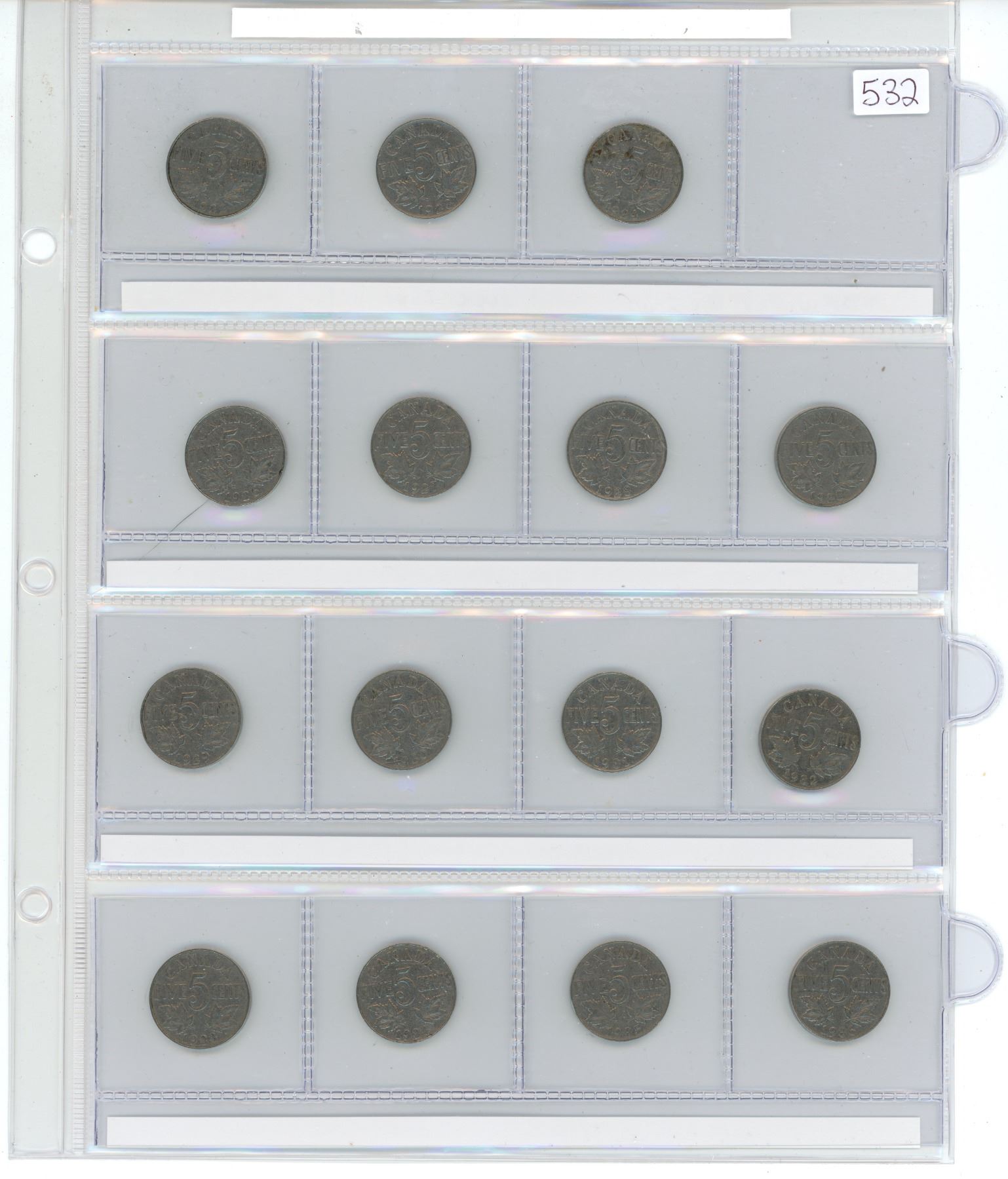 Near Complete Date Set of Canadian George V Nickel 5 Cents. 1922 to 1936. Missing only Key Date 1925. Coins grade up to VF-30.