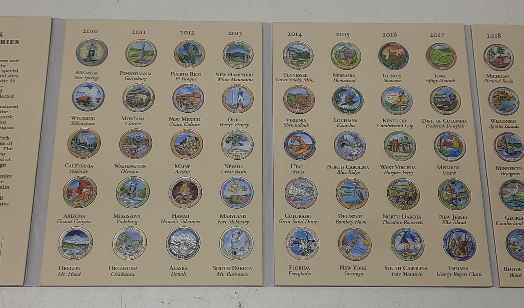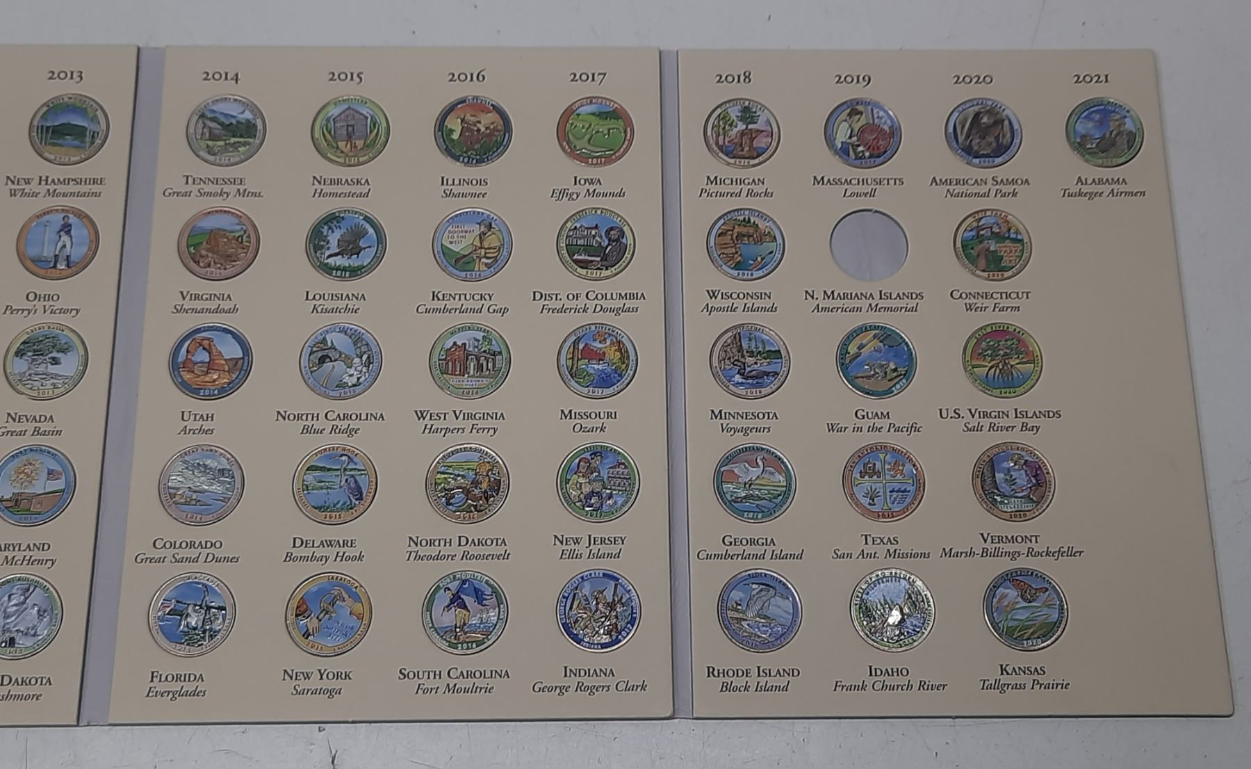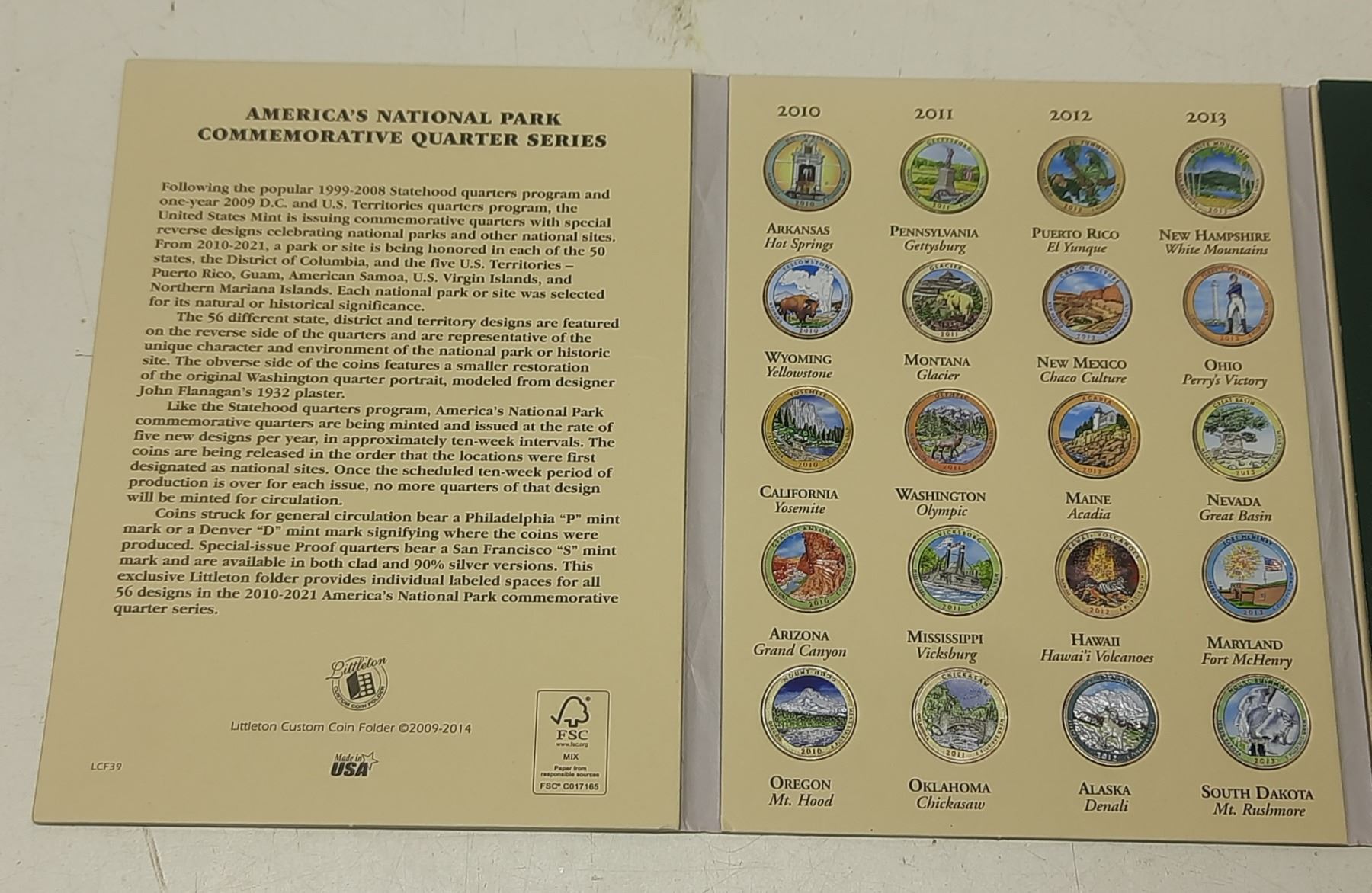 Near Complete Littleton Custom Coin Album for U.S. Nation Park Quarters. All are Coloured. Missing only 1 coin from the North Mariana Islands. A beautiful set.
