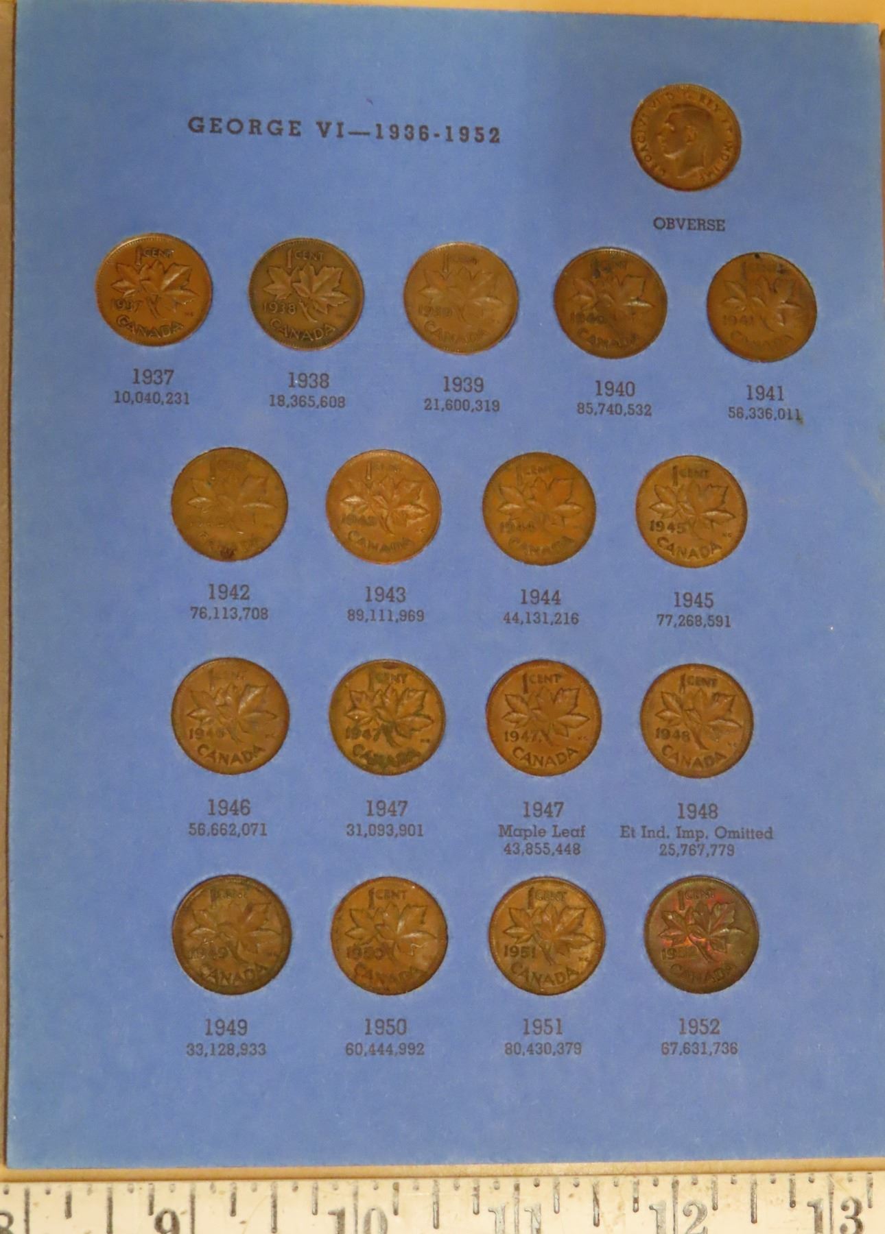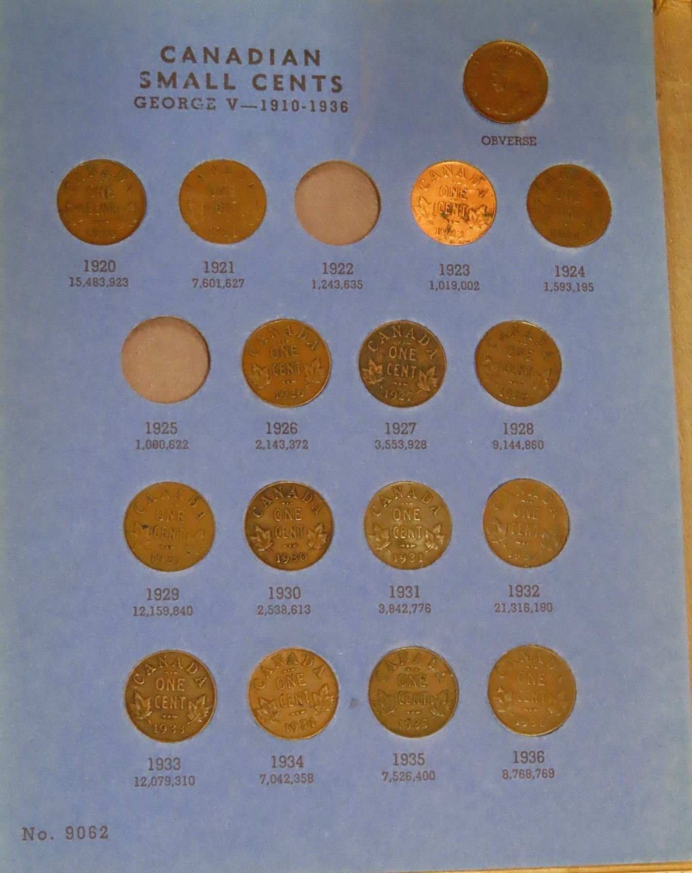 Near Complete Set of Canadian Small Cents 1920 – 1972. Missing only 1922 & 1925 but includes 1923, 1924 & 1926. Housed in a blue Whitman folder.