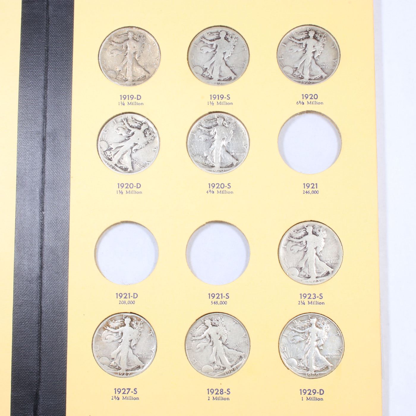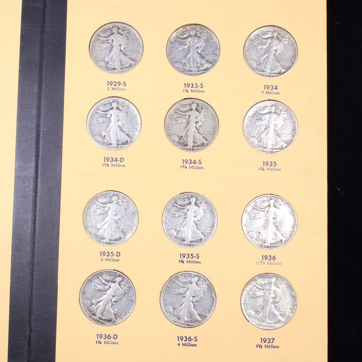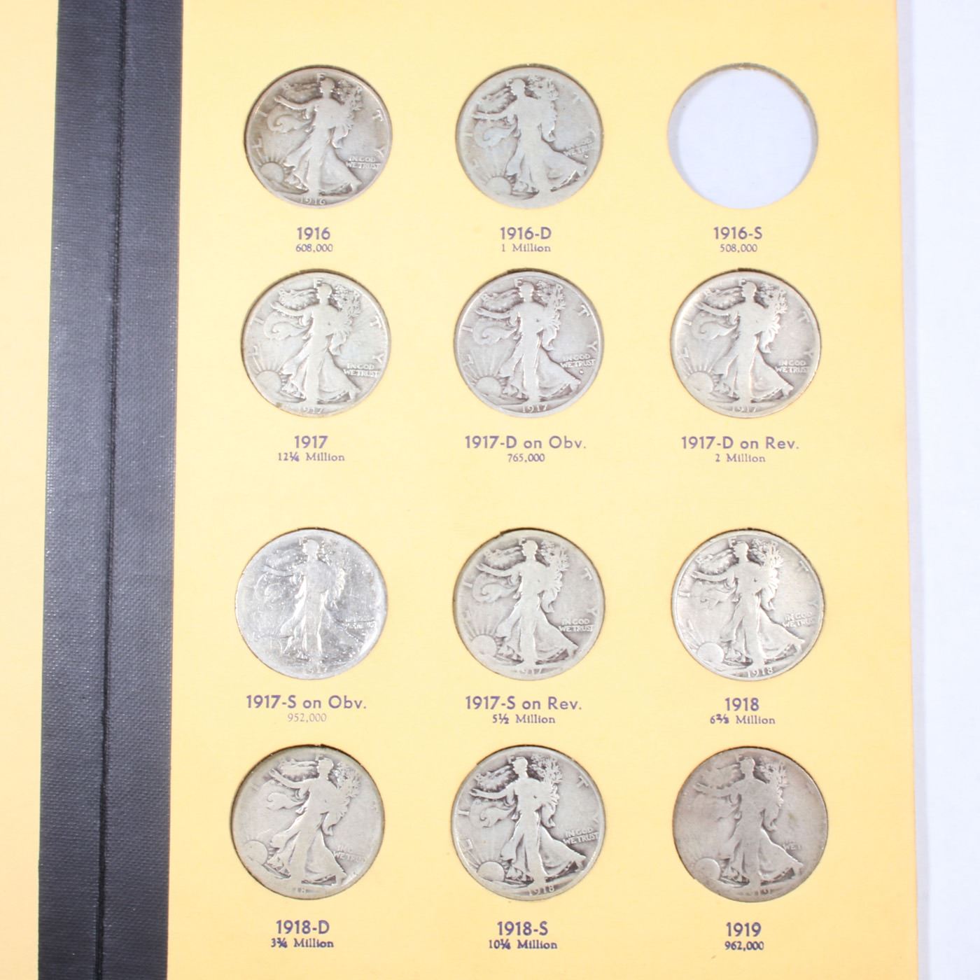 Near Complete Walking Liberty Half Dollar Book 1916-1937 32 coins. A Fantastic near complete Walking Liberty Half Dollar Book. Dates included are 1916-1937. All coins encased in a nice Coin and Currency Includes coin book. An Excellent grouping of 32 coins. Includes all the 17's including the 17-s Obv, the rare 1919-d & S, a lot of the coins rise to the grade of VF. Estimated Value $900