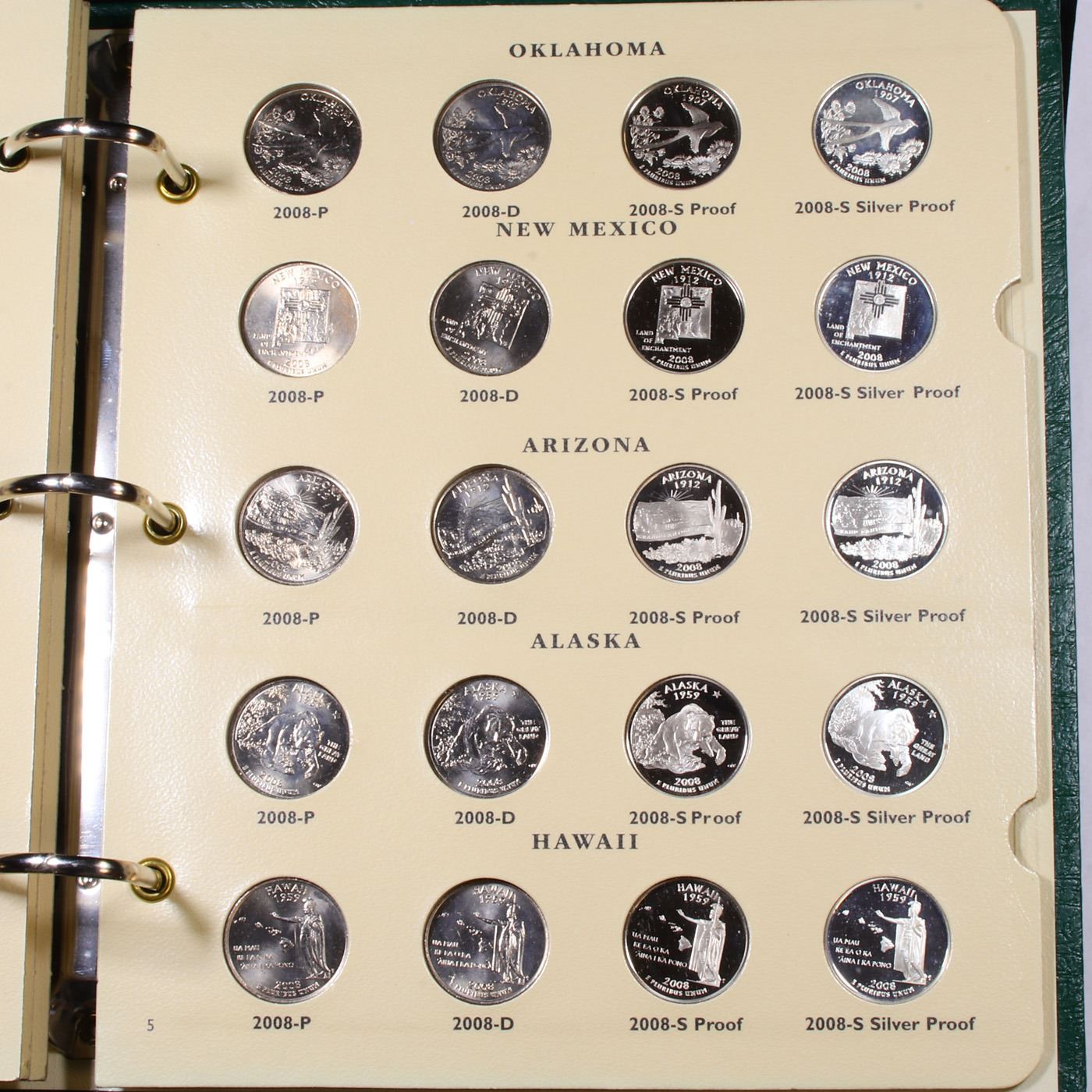 Near Complete Washington State Quater Book 2004-2008 98 coins. A Fantastic near complete Washington Quarter Book. Dates included are 2004-2008. All coins encased in a nice Littleton Coin Book. An Excellent grouping of 98 coins. Includes 25 silver proofs (about $125 in melt) and 25 Normal Proofs