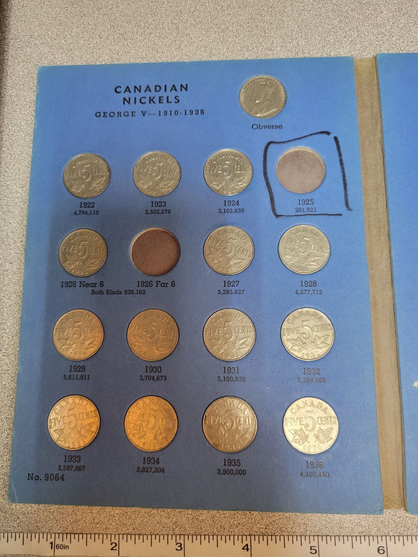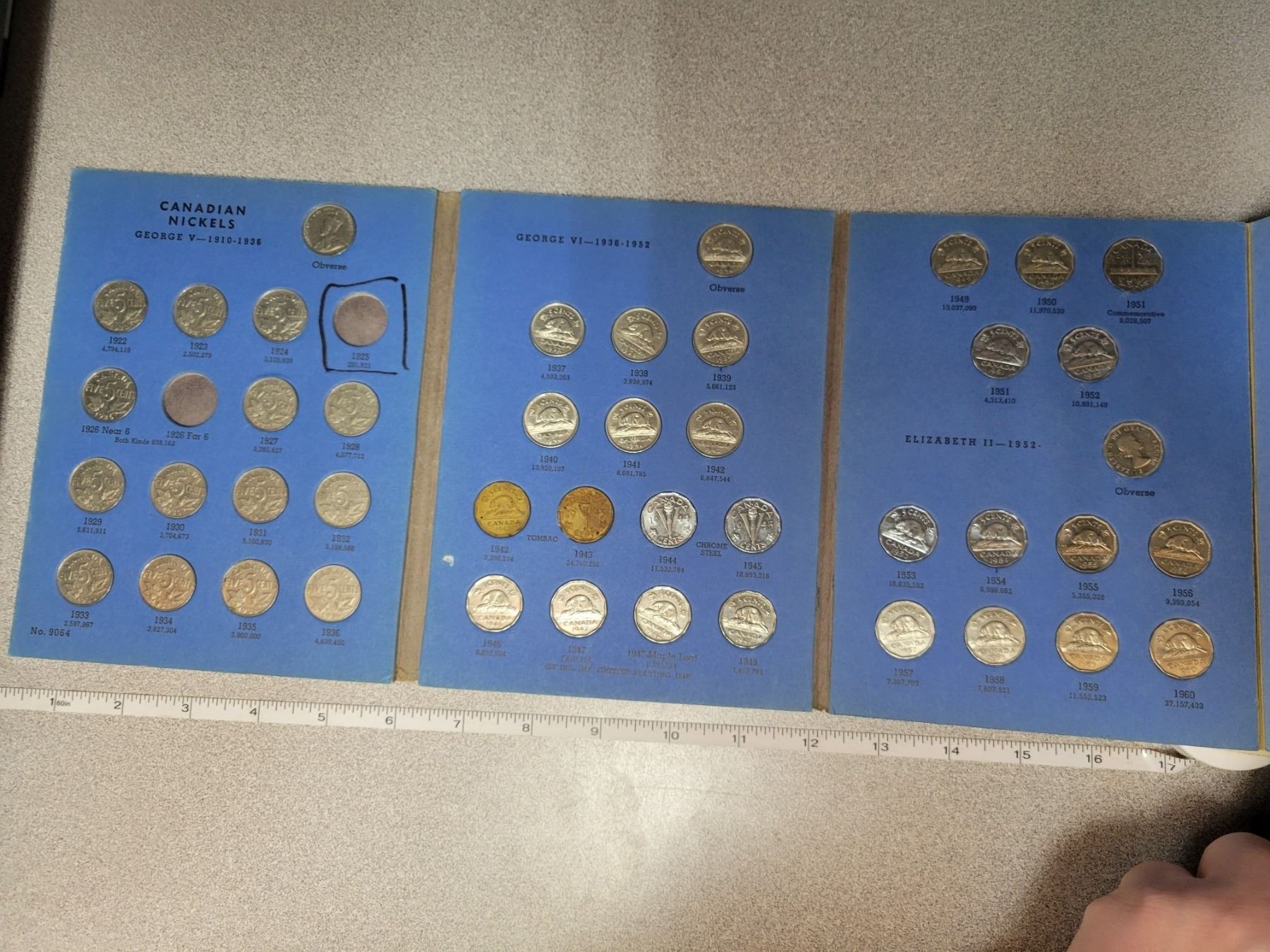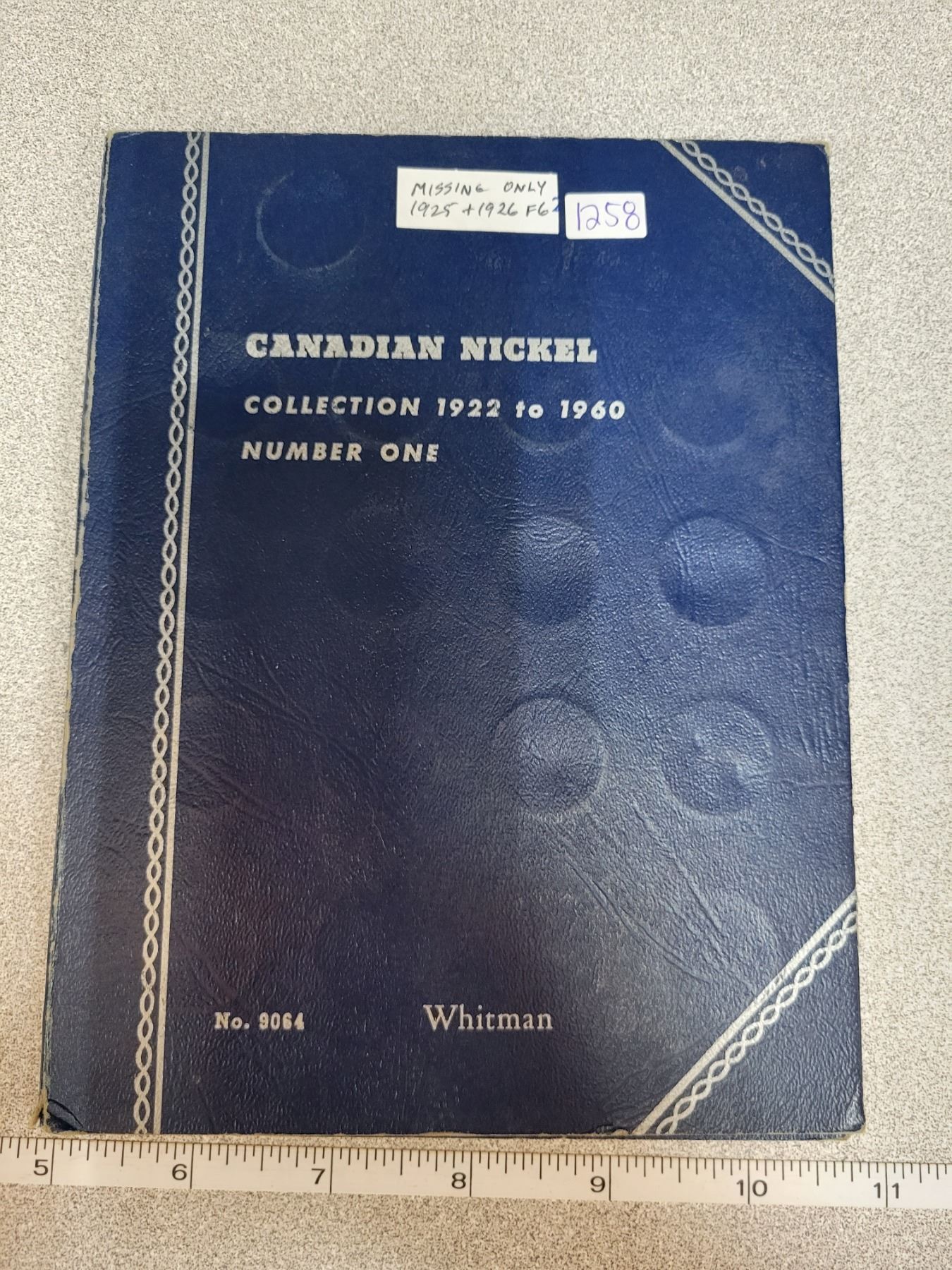 Near Complete set of Canadian Nickel 5 Cents 1922 – 1960. Missing only 1925 & 1926 Far 6. Coins grade Fine to Extremely Fine. Housed in a blue Whitman folder.