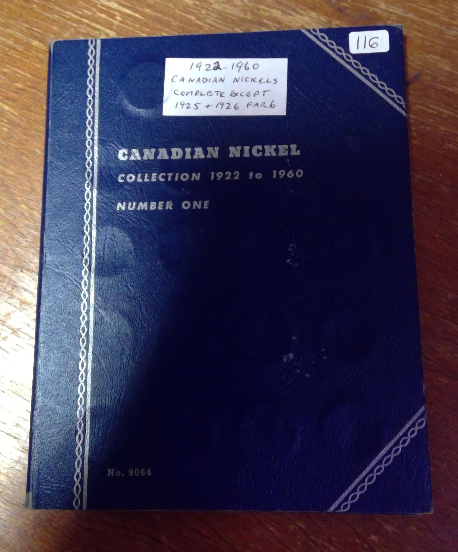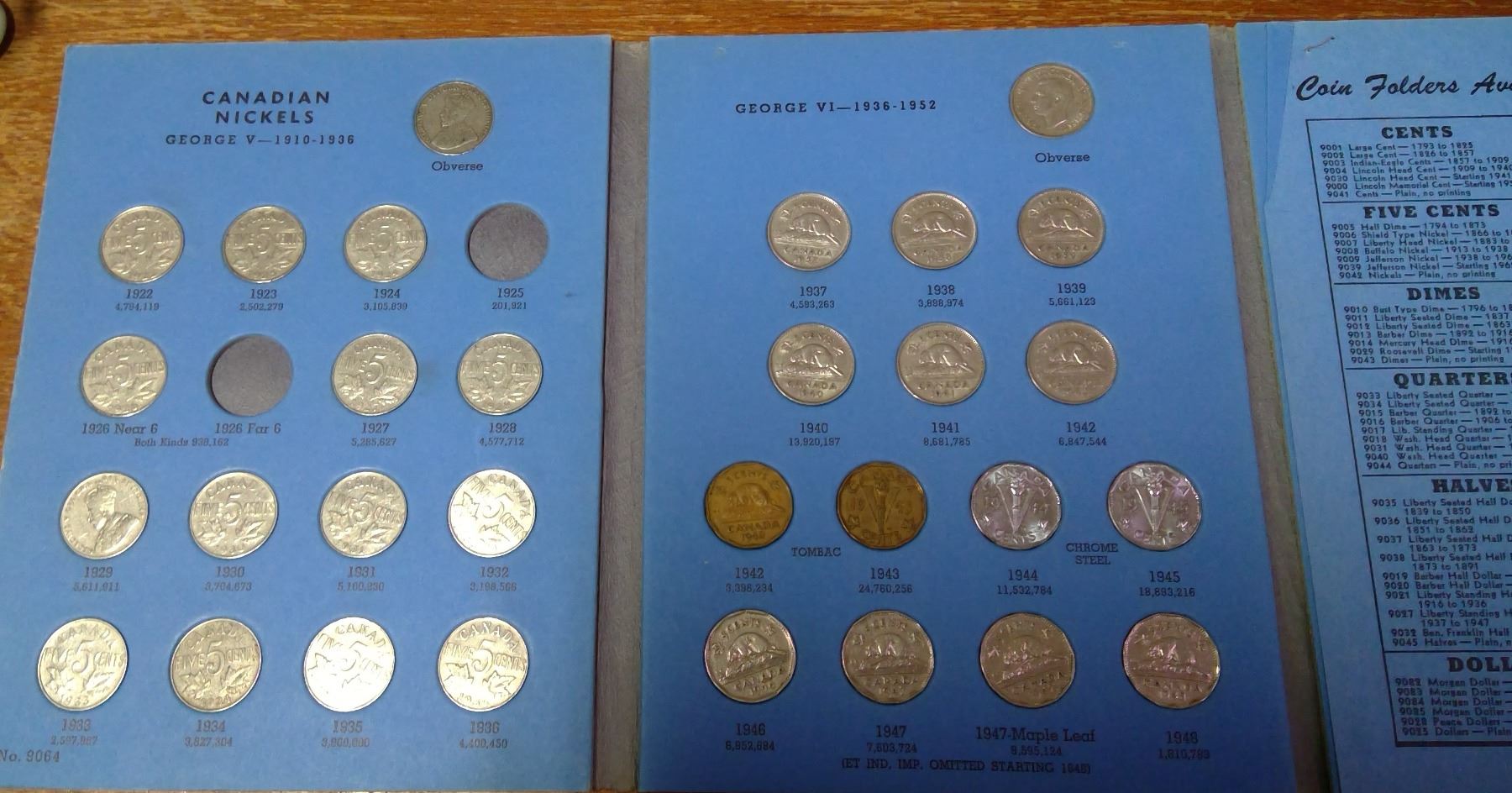 Near Complete set of Canadian Nickle 5¢. 1922-1960. Missing only key date 1925 & 1926 Far 6. Housed in a blue Whitman Folder. Coins grade F-12 to AU. Nice