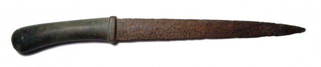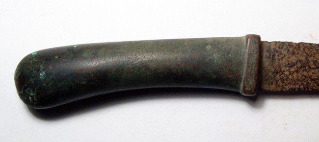 A Near Eastern iron knife with bronze handle, c. 12th - 14th Century or a bit later. The blade had been reattached to the handle, which is nicely preserved with areas of light green encrustation. Blade with stable oxide patina. L: 14 in (35.8 cm). Ex Los Angeles private collection.