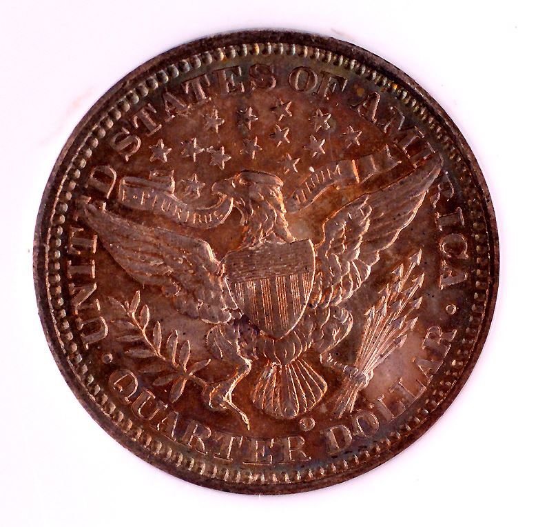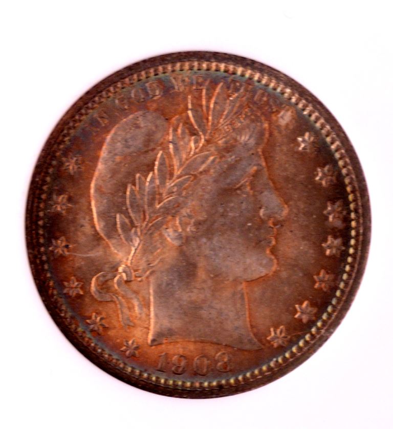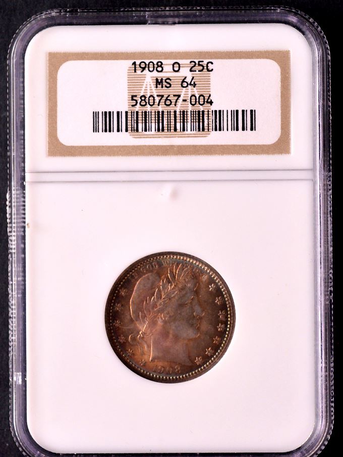 United States, Barber Quarter, 1908-O, graded by NGC Mintstate-64. Wonderful colour and great eye appeal. "CAC" anyone?