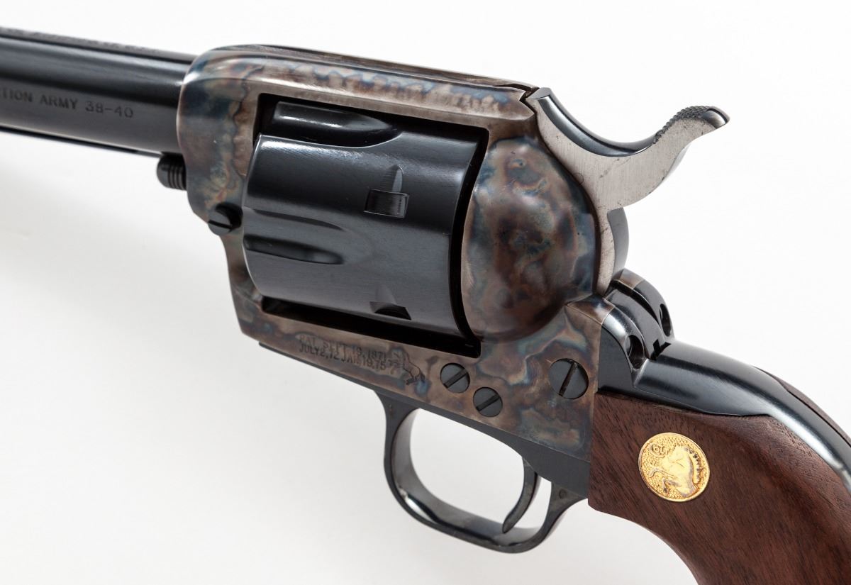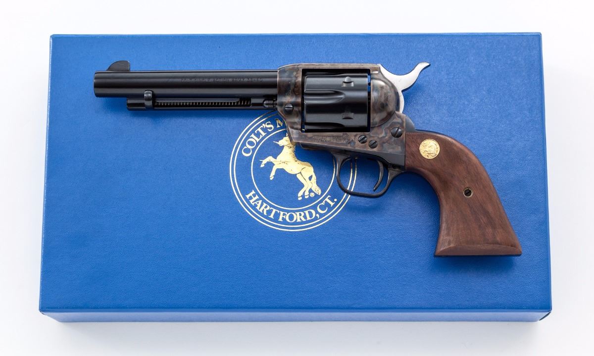 Near Mint Late 3rd Gen. Colt Single Action Army Revolver, #S06737A, .38-40 cal., 5-1/2'' barrel, blue and case hardened frame, smooth two-piece walnut grips with inlaid gold Colt medallions, standard sight, in blue two-piece Colt box that does not appear original to the gun, as the fitted insert does not match the contour of the gun. Also included is the original white outer cardboard box with matching end label, owner's manual and misc. paperwork. Condition is excellent, appearing as new, with only a few scattered light marks from handling. Cylinder shows no dragline. Case colors remain vibrant. Revolver appears unfired. Est.: $1,000-$1,500. (Modern/PPT)
