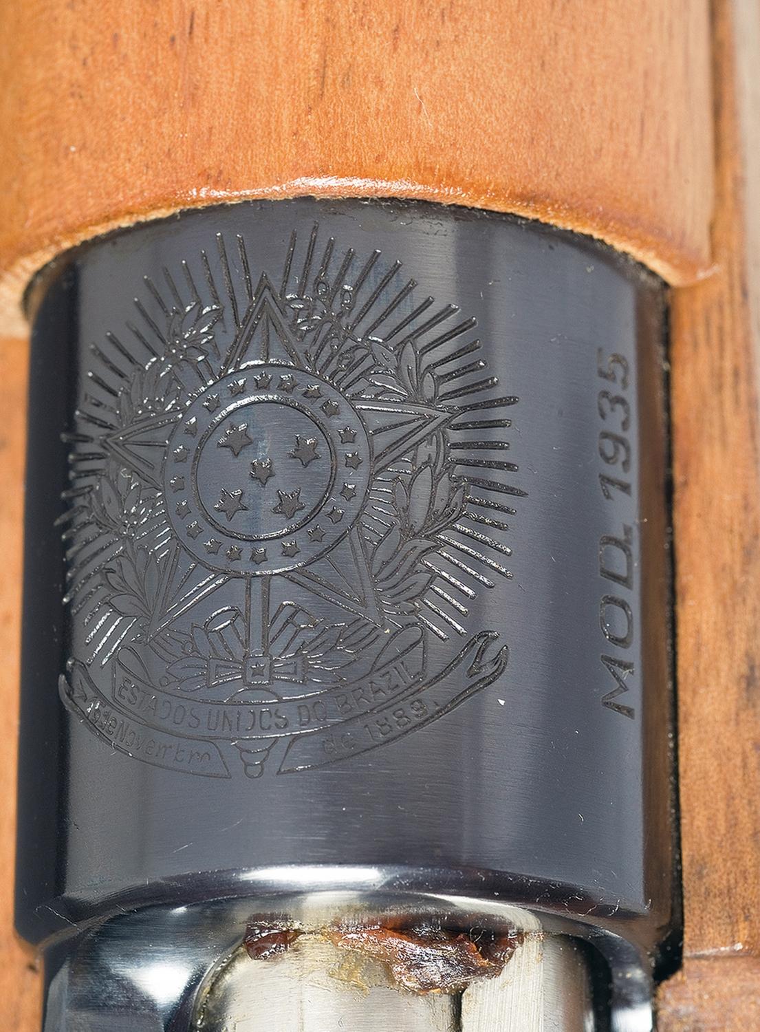 Beautiful all original, unaltered, near mint 1935 Brazilian Mauser, complete with matching bayonet. Receiver ring marked with Brazil crest with "Crown/U" and "Crown/N" proofs on the left and Mauser banner on rear ring. All matching numbers. Complete with push-on muzzle cover. Gun includes paper test target.
