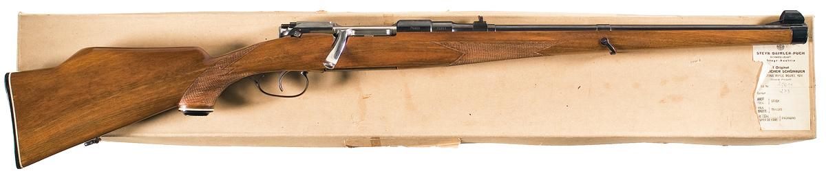 Standard receiver markings, hooded ramp front sight, two leaf rear sight, and a checkered pistol grip stock with raised cheekpiece, sling swivels, and serrated buttplate. With box numbered to gun.