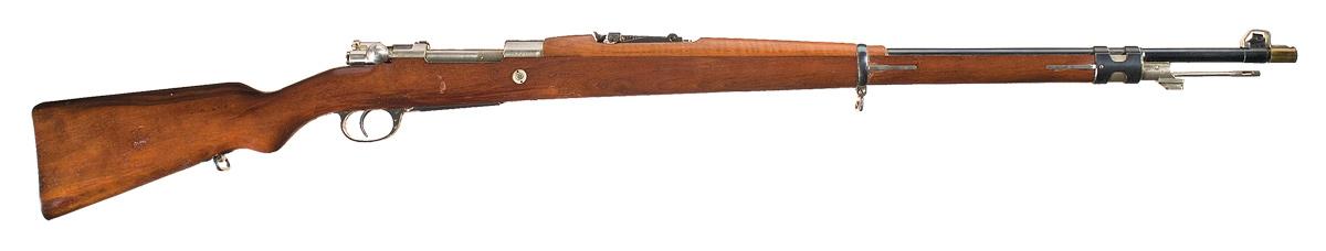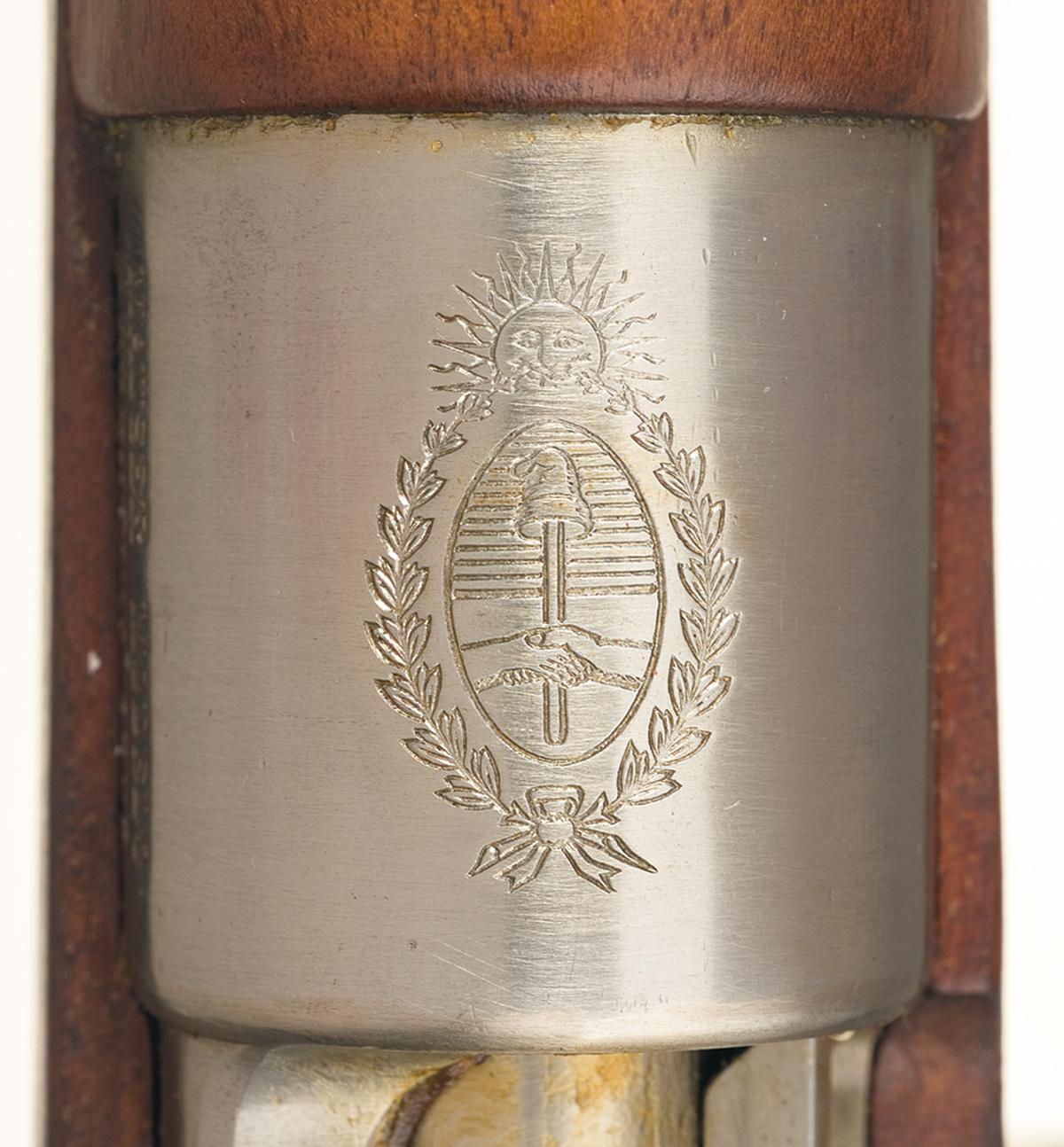 This is an exceptional near mint example of a prewar Mauser contract rifle manufactured for the government of Argentina. Blade and tangent sights, with the Argentine crest on top of the receiver ring, "MAUSER MODELO/ ARGENTINO 1909." on the left, and the DWM address on the sidewall. The rear sight has a small Argentine Navy "anchor" proof. Smooth stock numbered to match the gun, with the Argentinean Seal on the right side of the buttstock, and a few other small stamps. With muzzle cover.