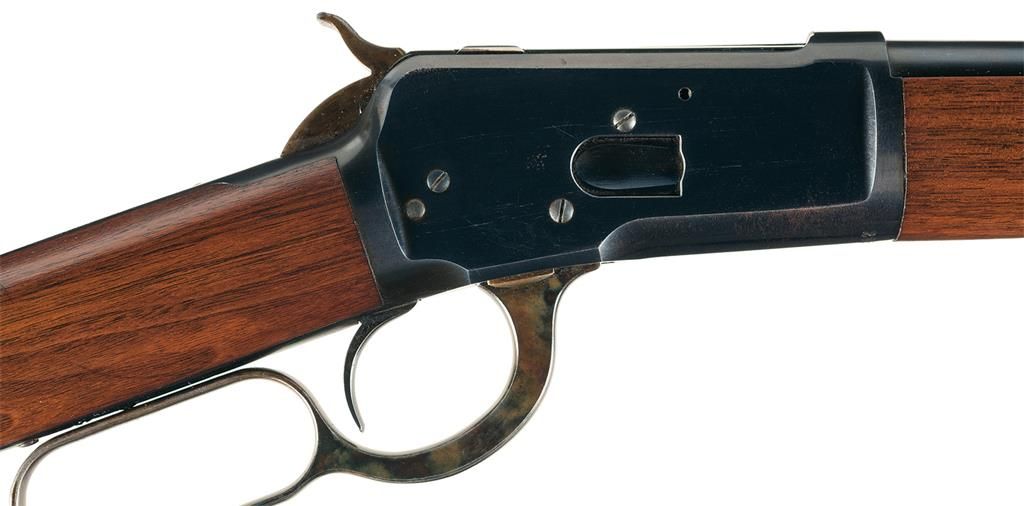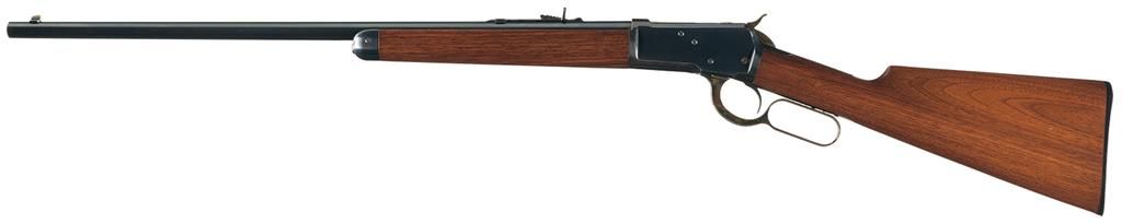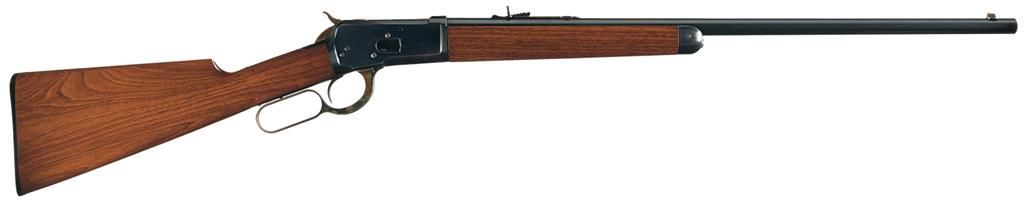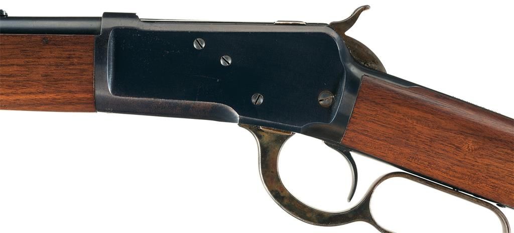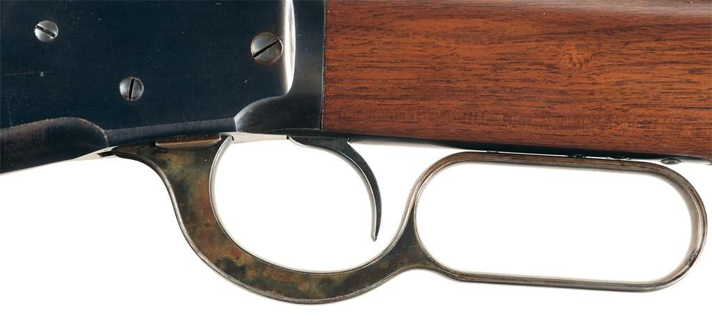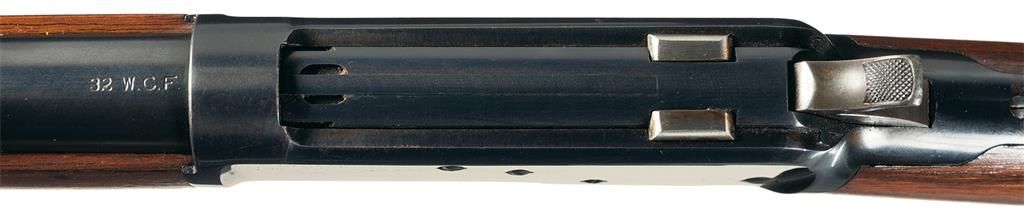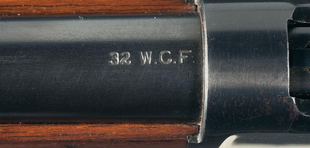 This is an extraordinary example of a special order Winchester Model 1892 rifle manufactured in 1902. The rifle has a 24 inch round barrel with special order half magazine and shotgun buttplate. The barrel has a sporting style front sight with nickel silver blade and a sporting style buckhorn rear sight with serrated edges and screw adjustable center insert. The upper tang is factory drilled and tapped for a rear sight. The barrel, forearm cap receiver, and bolt are blue and the hammer, trigger and lever are color casehardened. The stock and forearm are straight grain American walnut with a low luster varnish finish. The stock has a checkered black hard rubber shotgun style buttplate with the "Winchester Repeating Arms" logo in a circle in the center. The top of the barrel is roll stamped "MANUFACTURED BY THE WINCHESTER REPEATING ARMS CO./NEW HAVEN. CONN. U.S.A. PATENTED OCTOBER 14. 1884." ahead of the rear sight. The caliber designation "32 W.C.F." is roll stamped on the top of the barrel at the breech. The upper tang is roll stamped "MODEL 1892./-WINCHESTER-/PAT. OCT 14. 1884" and the serial number "235785" is roll stamped across the underside of the receiver.