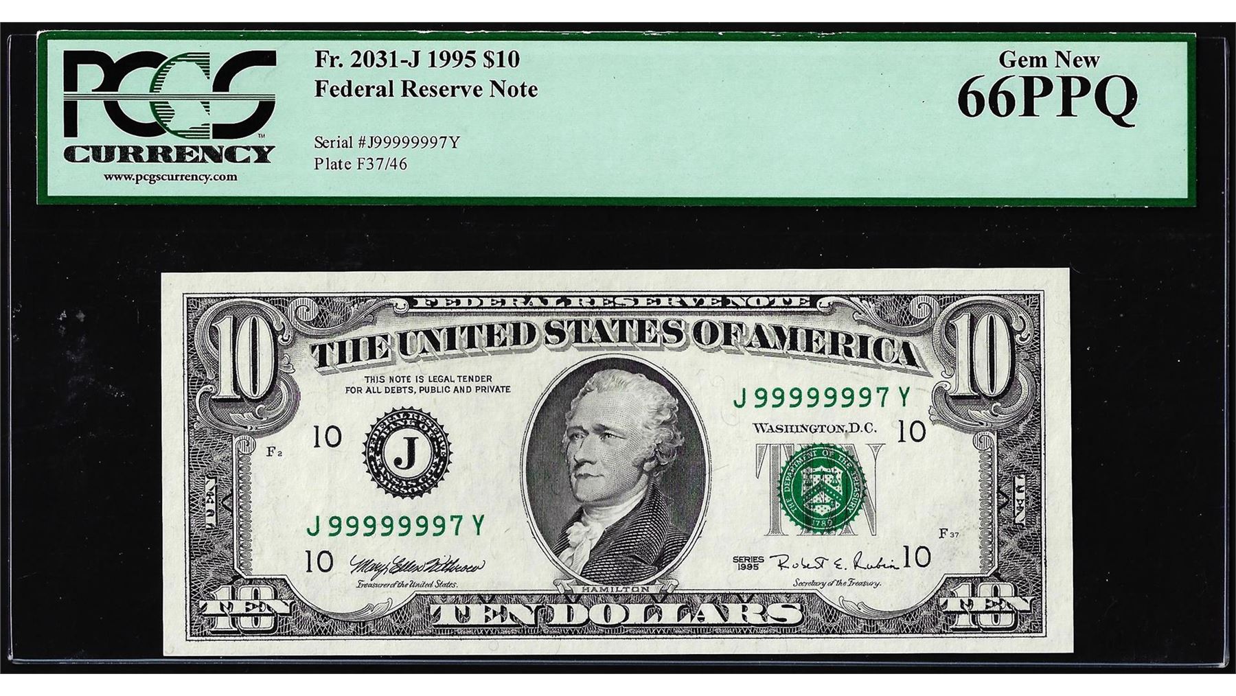 One Near Solid Serial Number 1995 $10 Federal Reserve Note Fr.2031-J PCGS Gem New 66PPQ. PCGS Graded.