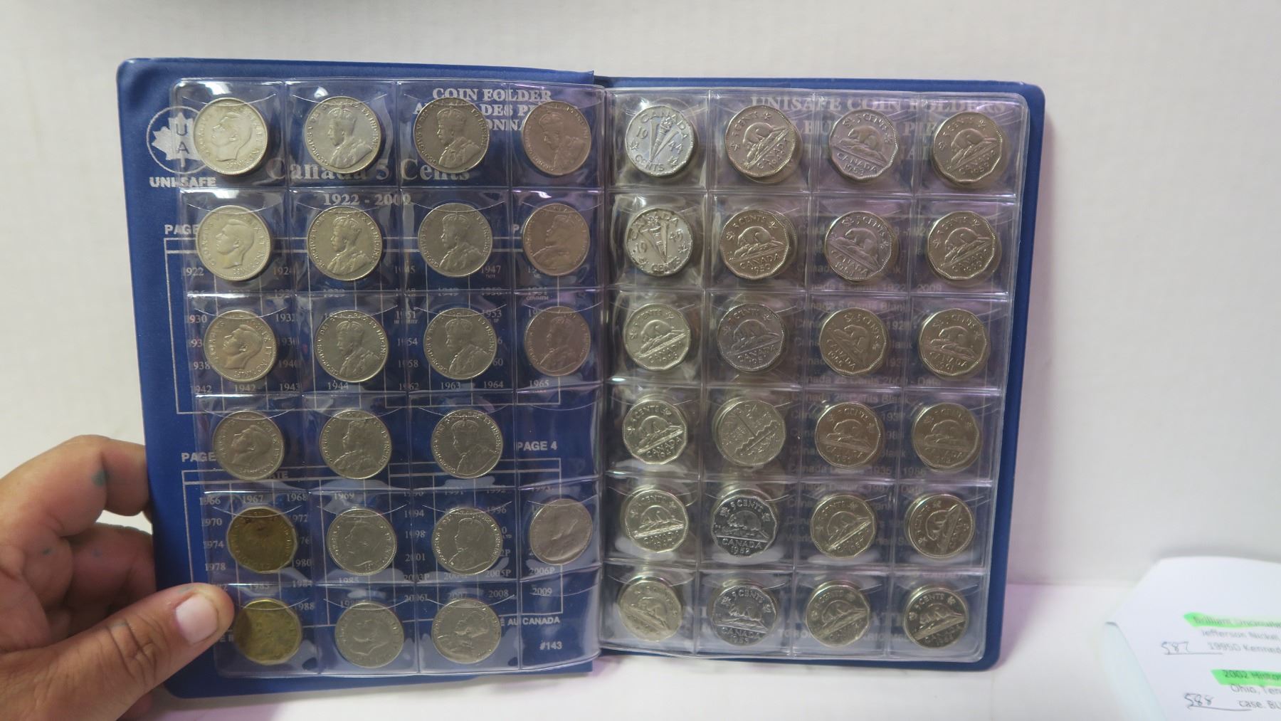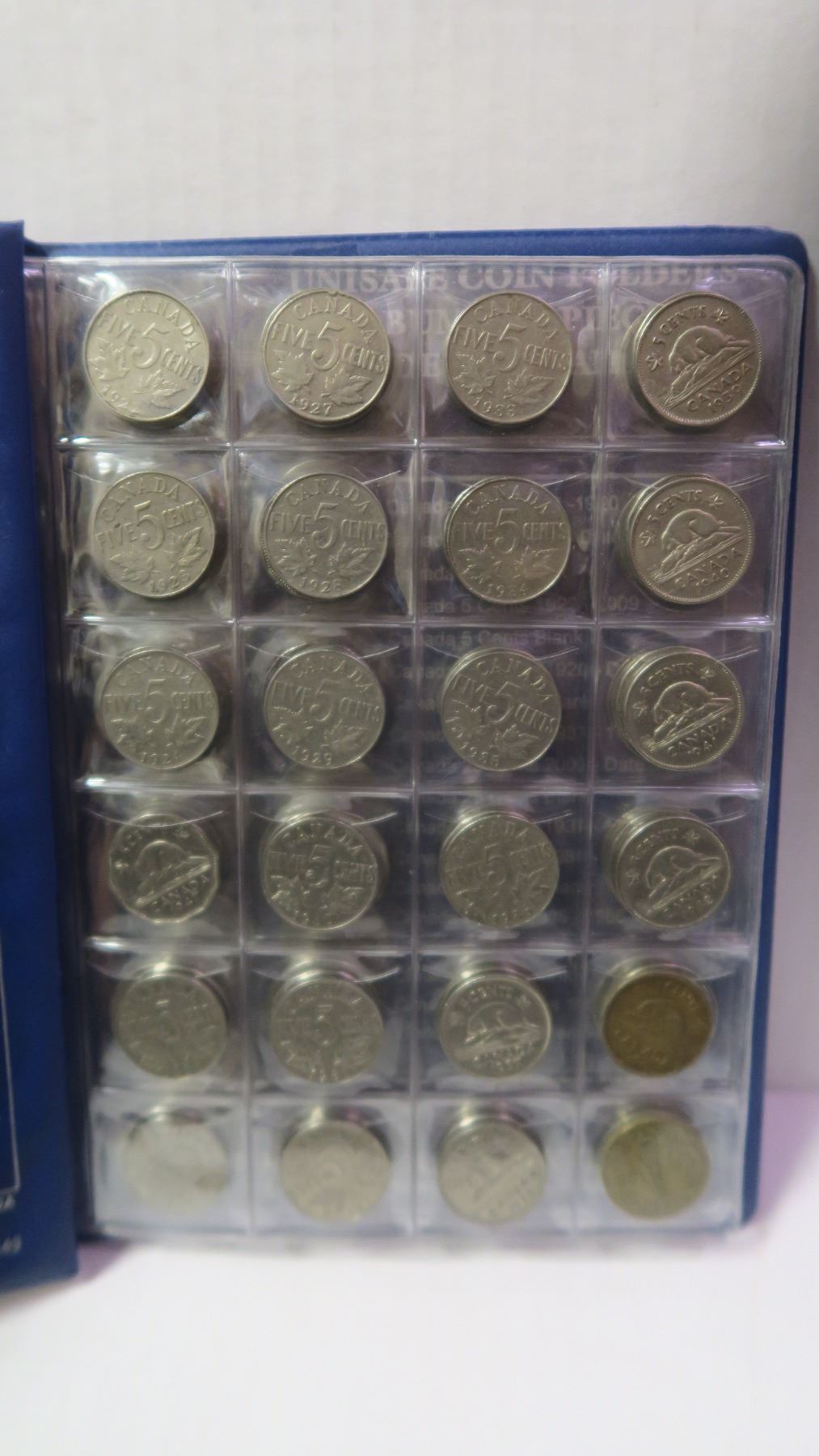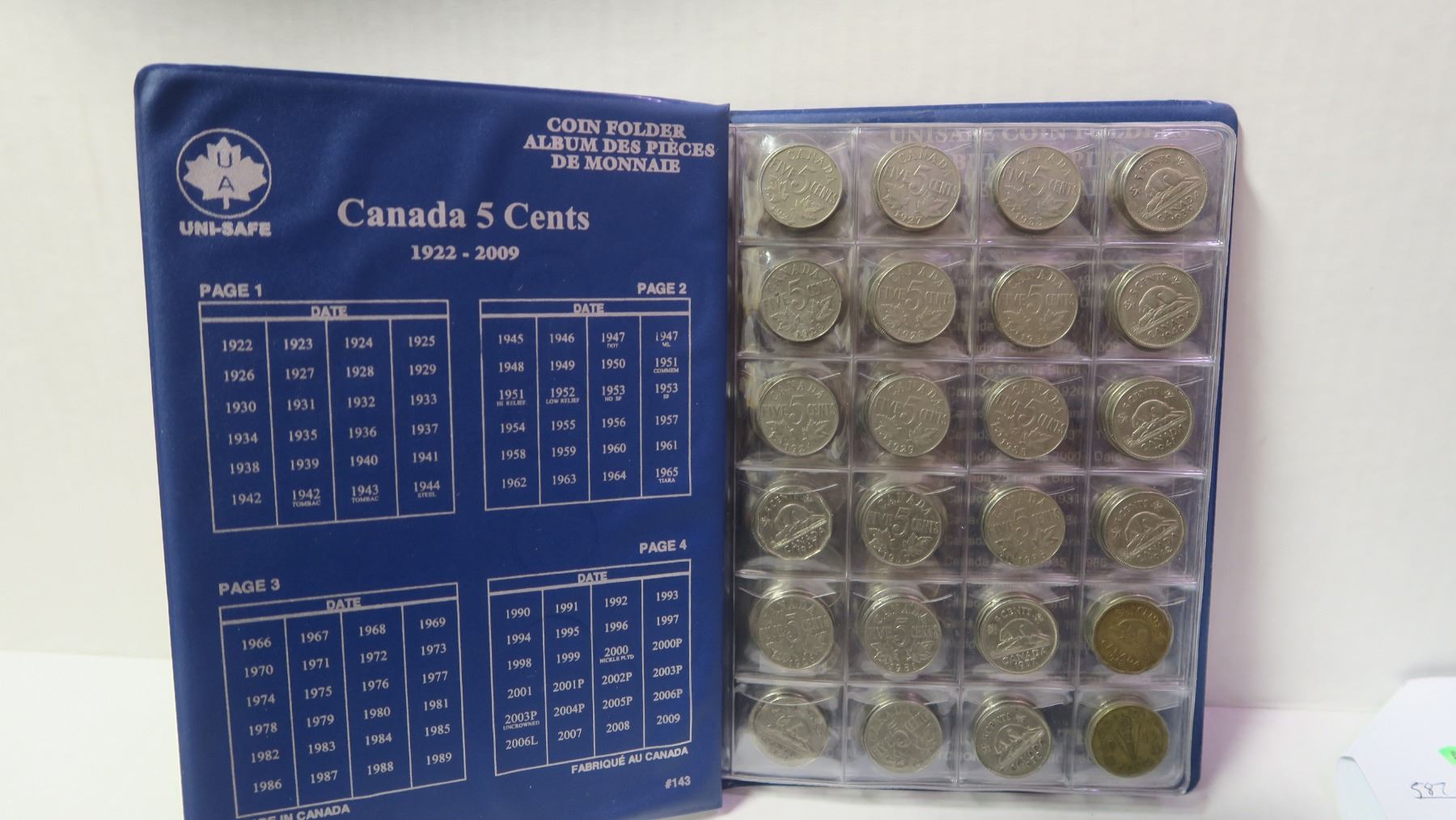 Near complete set of Canadian Nickel 5 Cents 1922 to 2014. Missing only Scarce 1925, 1926 Far 6 and 1947 Dot. Coins grade VG-8 to BU. Housed in a Uni-Safe album.