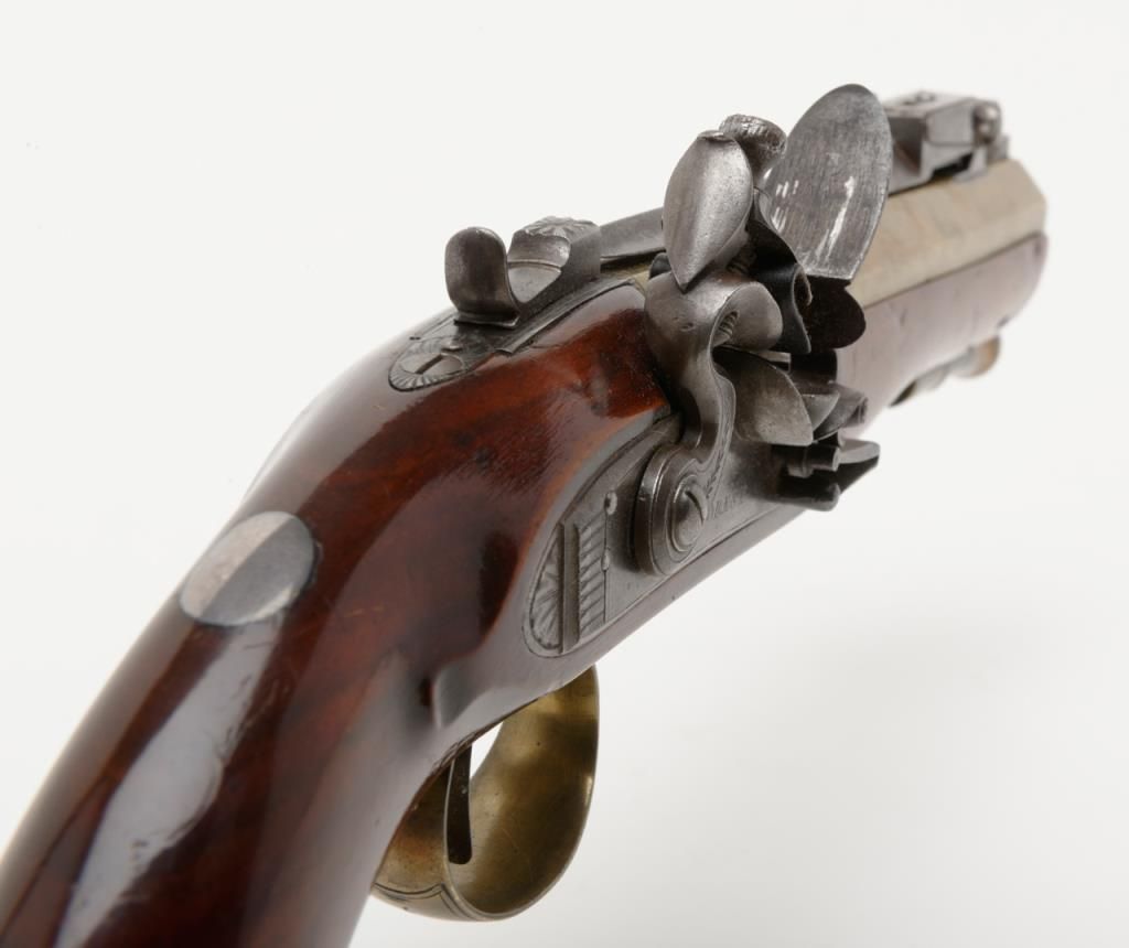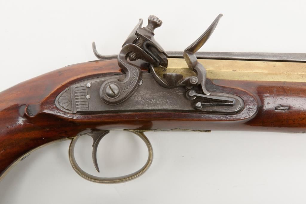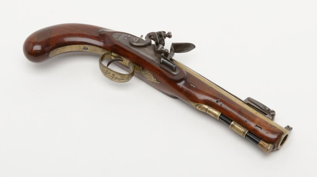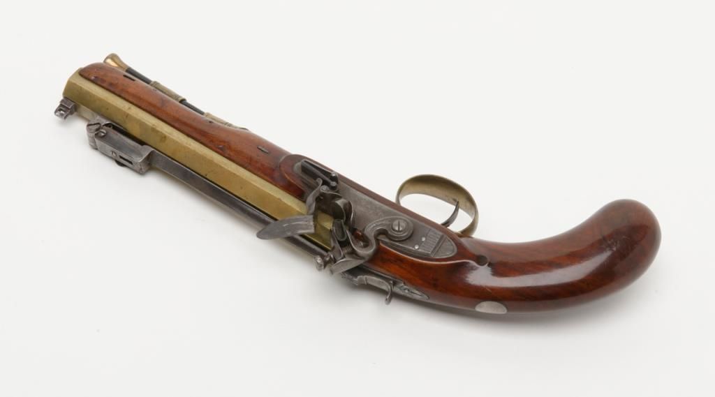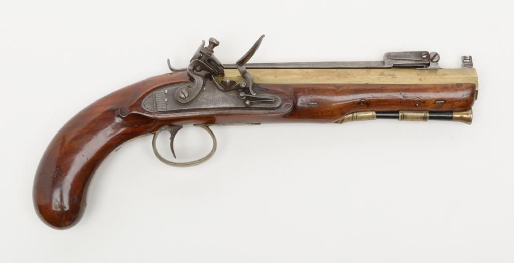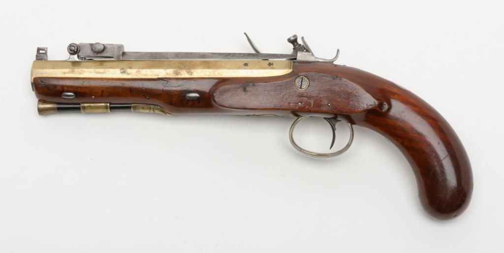Near fine original flintlock pistol with top mounted spring bayonet signed “Forest, London” circa early 19th century. The pistol shows an 8” somewhat heavy and thick walled octagon barrel of approximately .64 caliber smoothbore. The pistolmeasures 14” overall. The lock shows its original hammer, top jaw screw and parts. The condition is very good plus to near fine overall with just some minor scratches and aging to the wood but retaining most of the original finish. The lockshows strong traces of sedate original case hardening. The bayonet is original and snaps with authority. An original to the period ramrod is included which is probably the original to this pistol. English flintlock pistols with originalsnap bayonets are always desirable particularly with brass barrels. Est.: $3,000-$6,000