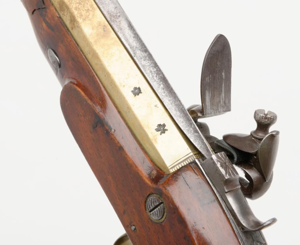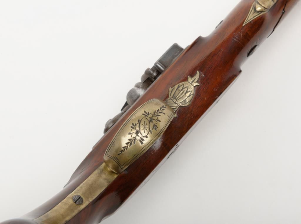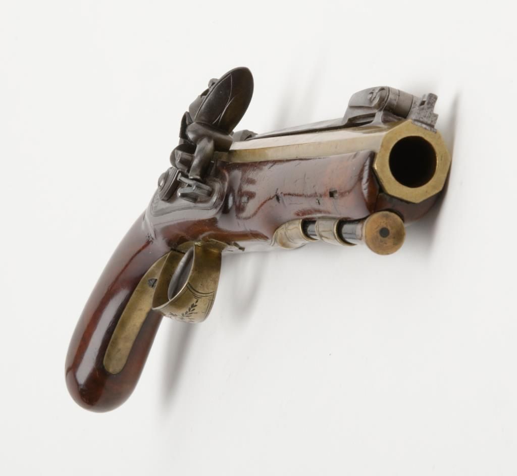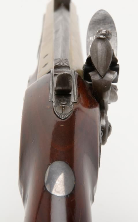 Near fine original flintlock pistol with top mounted spring bayonet signed “Forest, London” circa early 19th century. The pistol shows an 8” somewhat heavy and thick walled octagon barrel of approximately .64 caliber smoothbore. The pistolmeasures 14” overall. The lock shows its original hammer, top jaw screw and parts. The condition is very good plus to near fine overall with just some minor scratches and aging to the wood but retaining most of the original finish. The lockshows strong traces of sedate original case hardening. The bayonet is original and snaps with authority. An original to the period ramrod is included which is probably the original to this pistol. English flintlock pistols with originalsnap bayonets are always desirable particularly with brass barrels. Est.: $3,000-$6,000