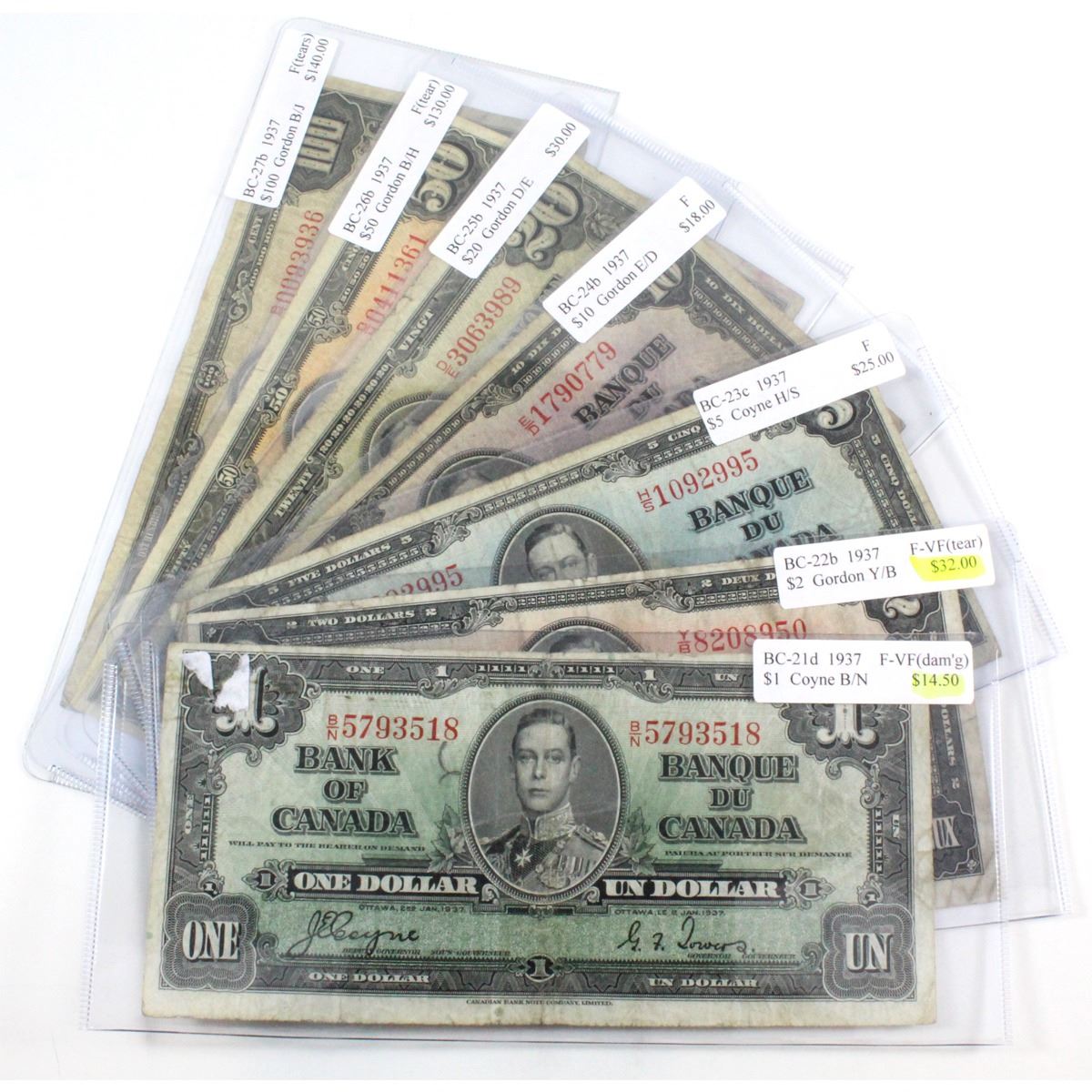 Nearly Complete Denominational Type Set of the 1937 Series in Good or Better Condition. You will receive an example of nearly every denomination available in the Series; only missing the $1000.00. Buyers Premium will be added on all items as per our terms of sale. We accept Paypal, Credit Card, E-Transfer Payments, Cheque or Money Orders (there is an additional 3% fee for using Paypal or Credit Card). All invoices will be emailed immediately following the auction, please contact us if you would like to pay by credit card or receive a new revised lower total for mailing in payment or sending an e-transfer (3% discount). All Items Are Sold "AS IS", no returns