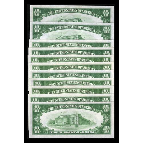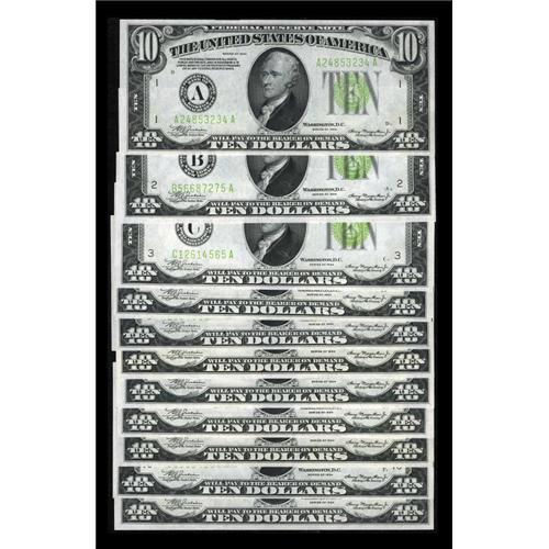 <B>Nearly Complete District Set Fr. 2004-A-L $10 1934 Light Green Seal Federal Reserve Notes. Crisp Uncirculated or Better.</B></I><BR> Only the absence of a note from the Dallas Fed prevents this district set from being complete. Original paper wave is easily seen with several of these notes having aspirations to the choice status.<BR><I>From The Thomas M. Flynn Collection</B></I><BR><BR><b>Shipping:</b> Coins & Currency (<a target="_blank" href="http://www.heritageauctions.com/common/shipping.php">view shipping information</a>)