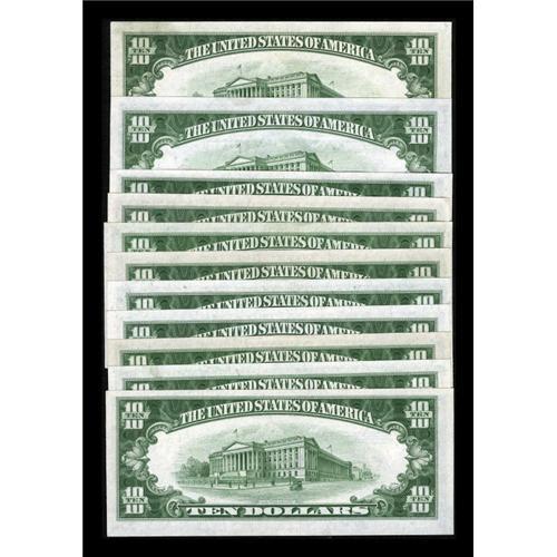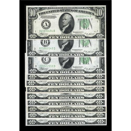 <B>Nearly Complete District Set Fr. 2007-A-L $10 1934B Federal Reserve Notes. About Uncirculated or Better.</B></I><BR> Eleven notes are included in this set which is missing only the Kansas City district. While the Cleveland note has a center fold, the other ten pieces all grade at least <B>Crisp Uncirculated</B></I>.<BR><I>From The Thomas M. Flynn Collection</B></I><BR><BR><b>Shipping:</b> Coins & Currency (<a target="_blank" href="http://www.heritageauctions.com/common/shipping.php">view shipping information</a>)