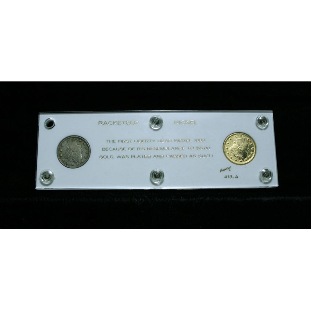 The Set has a gold plated 1883 n/c Liberty 'V' Nickel and a regular 1883 n/c Liberty 'V' Nickel. Because the first 1883 Liberty Head ‘V’ nickels did not contain the words ‘FIVE CENTS,’ and also because the coins are about the same diameter and look somewhat similar to the then-circulating $5 Liberty gold coin, some people took it upon themselves to gold-plate 1883 no-cents Liberty nickels and try to pass them off as $5 gold coins. Apparently, this was a somewhat pervasive problem at the time and the United States Mint soon added ‘FIVE CENTS’ to the reverse of the coin under the ‘V’ to ward off any further counterfeiting attempts. Estimated Value $20