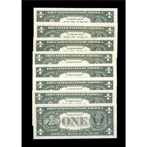 <B>Neat Down Ladder Radar Set. Eight Examples. Choice-Gem CU.</B></I><BR>This great fancy group lot starts off with a series 1981A $1 FRN that carries serial number H09877890A and finishes with $1 FRN 1988A G32100123K. All your number combinations are represented here.<BR><BR><I>From the Scottsdale Collection</B></I>