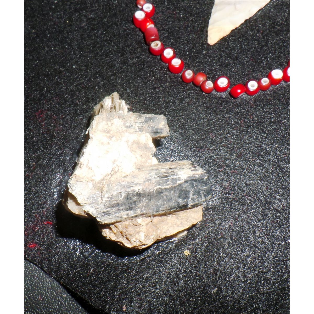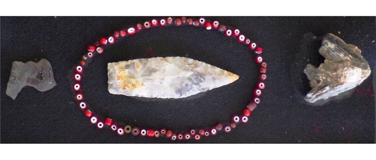Nebo Hill Flint Spear approx. 2500 years old. This 3 color chert spear is approx. 4" x 1 1/2" and is from Central Missouri. It may have been rechipped in ancient times. Lot also includes white hearts beads, nice tourmaline and mica mineral specimen. Condition: Minor wear and nicks as found. Shipping: $14.50.