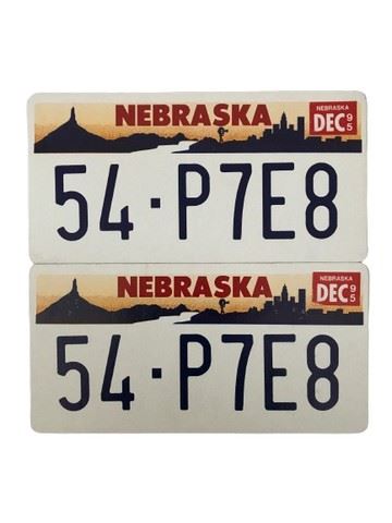 A pair of Nebraska prop license plates. Made of cardboard. Used in various movies /tv shows.