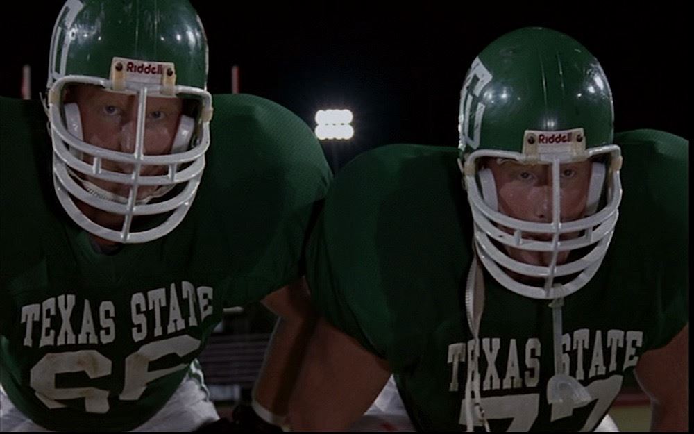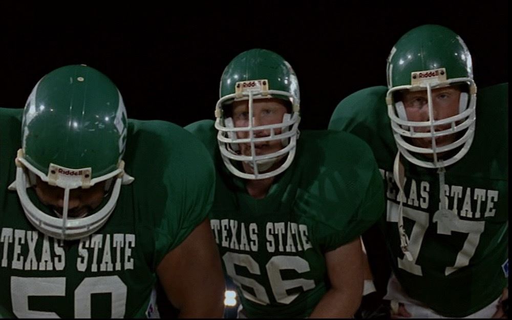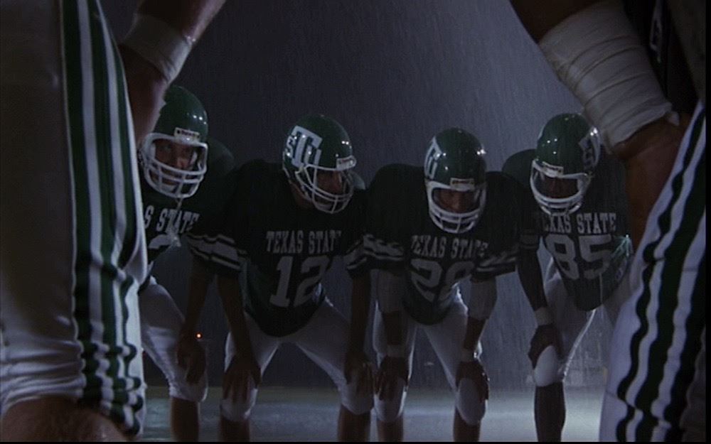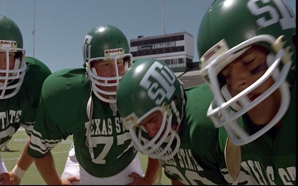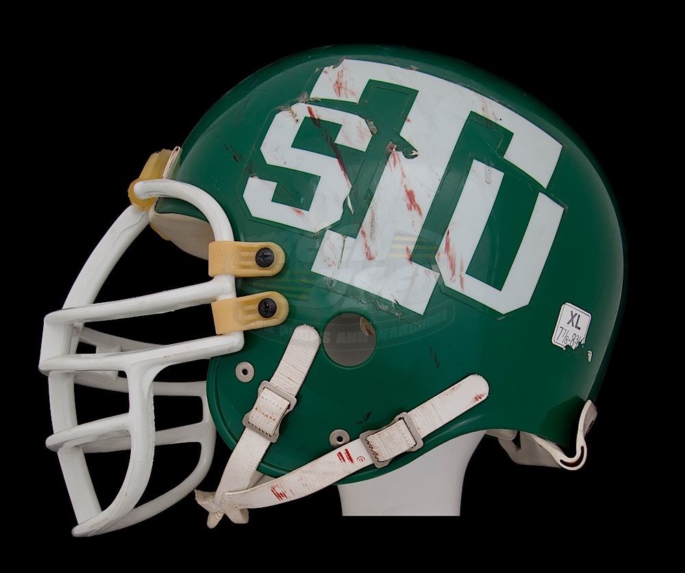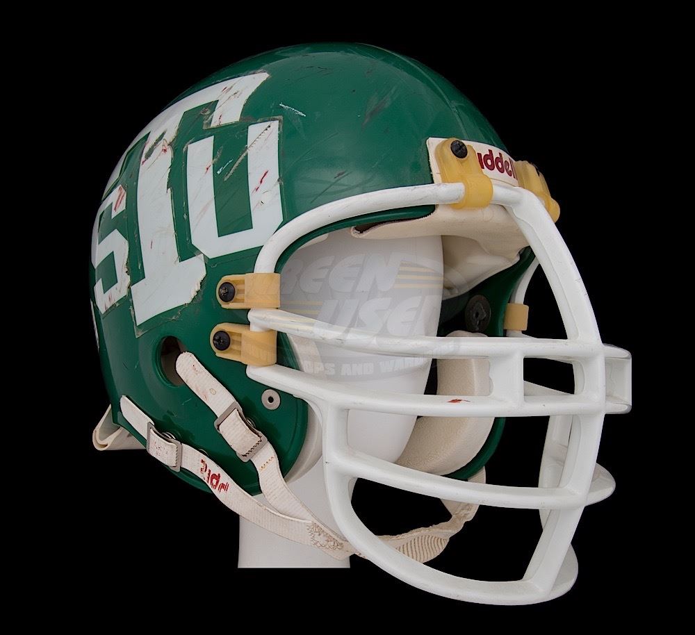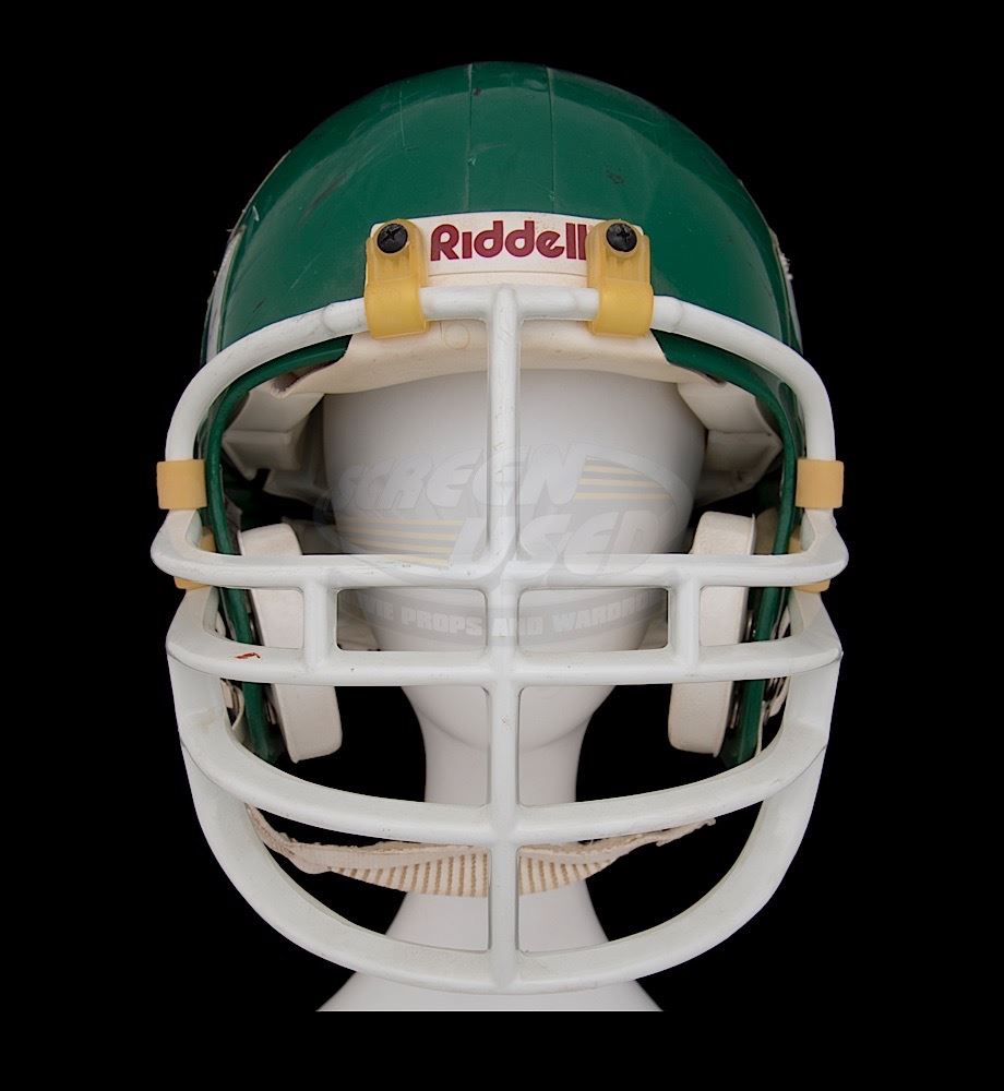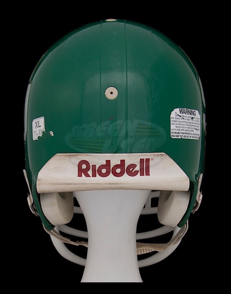 (Paramount Pictures, 1991) This football helmet was acquired by the production for use by various actors during filming. The green Riddell helmet has Texas State University logo stickers applied to each side. This helmet also features unique wear and scratches that match exactly on screen. Wear from use is present.
