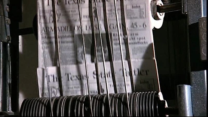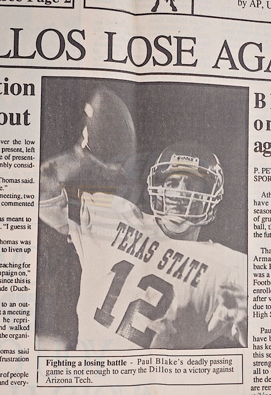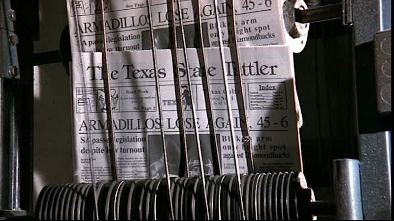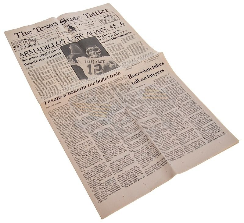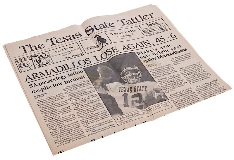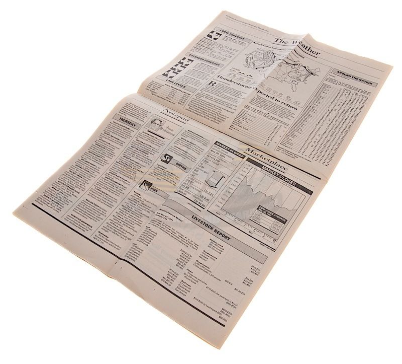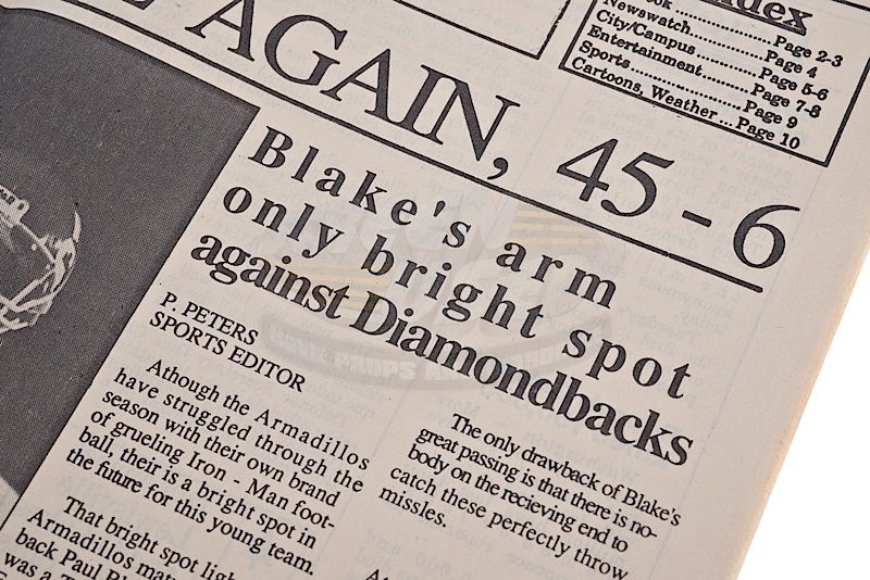 (Paramount Pictures, 1991) This prop newspaper was custom-printed by the production for use by various actors and as set dressing. The newspaper features the headline "Armadillos Lose Again, 45 - 6" with an image of Paul Blake (Scott Bakula) and other various articles. Some of the inside pages are blank, with minor wear from use present.