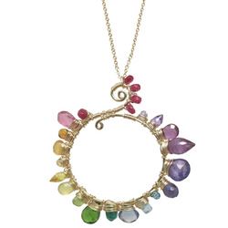 Metal: RoseGold Hammered circle wrapped with pink ruby, citrine, orange sapphire, yellow sapphire, peridot, chrome diopside, tanzanite, blue topaz, amethyst, on multi-chain, about 18" (circle part is about 1-3/4"). Available in either 14K gold-filled, rose gold-filled, or sterling silver. All jewelry is entirely handmade in our studio in New York.