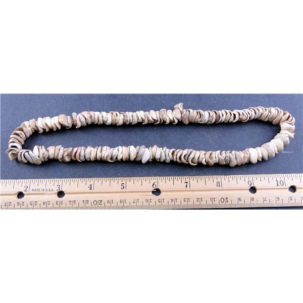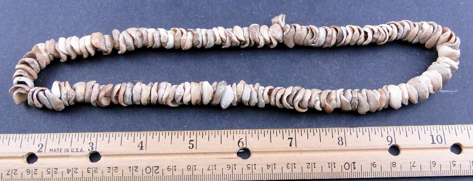 Description: A necklace about 18” long total, irregular cut olive shell beads. See Opitz, p. 367