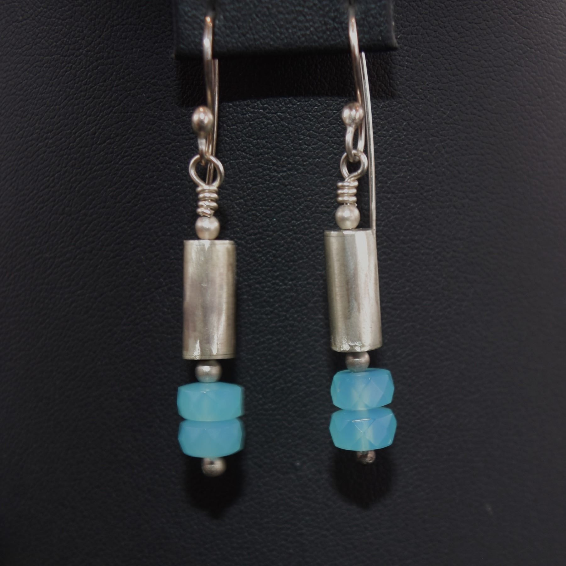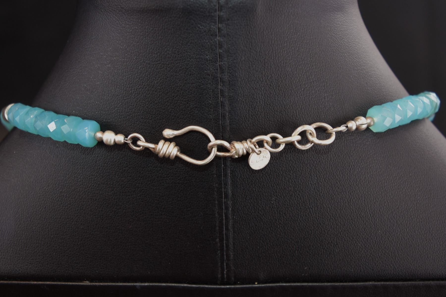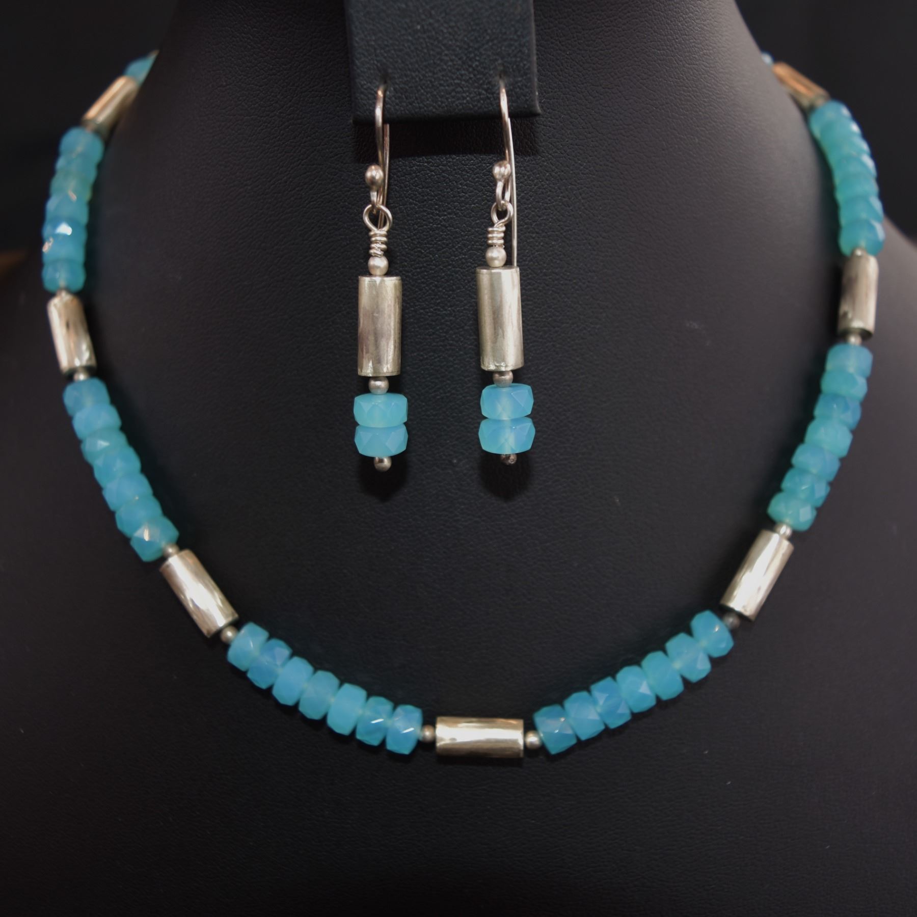 Aqua faceted, translucent chalcedony beads and brushed silver beads, Elizabeth Romero in Santa Fe, NM. Necklace: 19" Length, 38 grams, Earrings 2" Length, 6 grams together