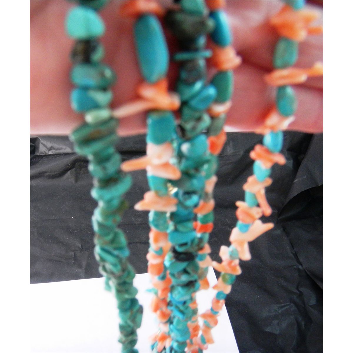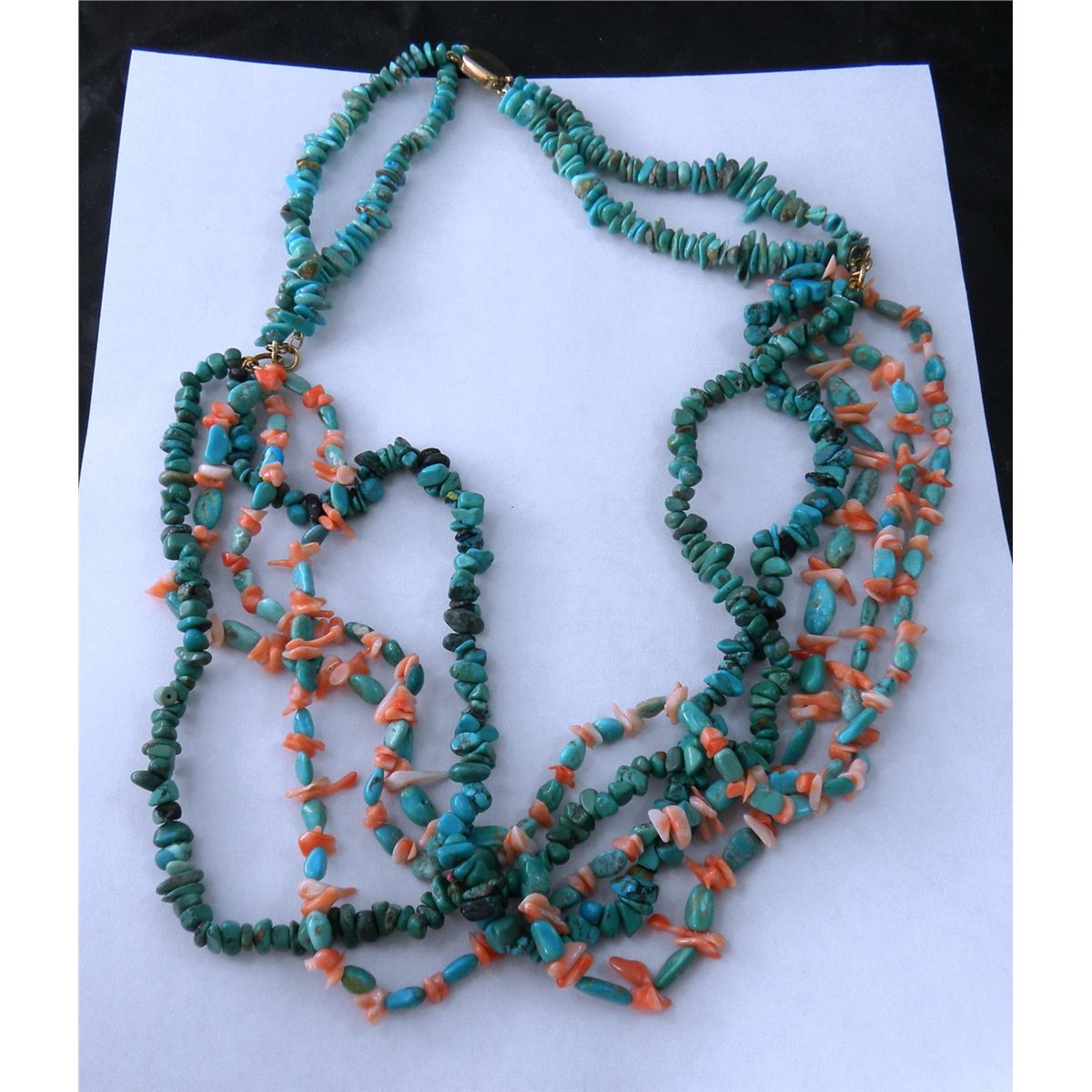 Nugget Turquoise and Angel Skin Coral Necklace. The Necklace has five strands with a detachable top portion of 2 strands turquoise only which could be used as bracelet. Measures 23" total Shipping $15.00