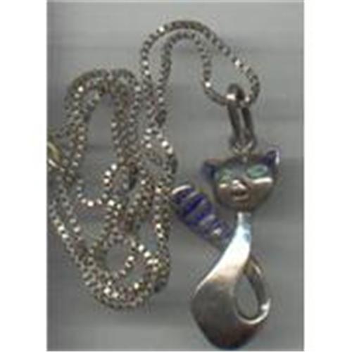 This little Italian cat is gorgeous!! She really is. The bail is stamped 925 and Italy. The enamel is intact. No makers mark. The chain is not original to the pendent. We added it. It is a sterling box link chain. It has a makers mark we do not recognize. The chain is aprox. 20" long. The clasp on the chain has been replaced and will need a new one. The replacement was an old brass one.(not us!!) She is quite a looker! She measures approx. 1"X3/4". The shipping fees quoted are for priority/Insured in USA.