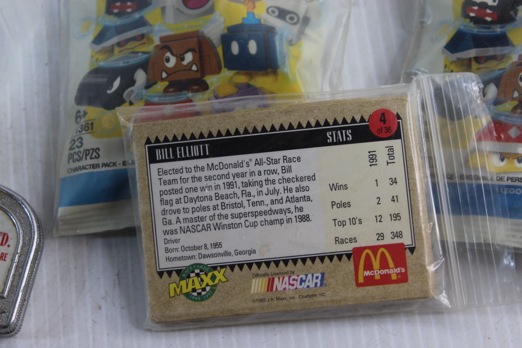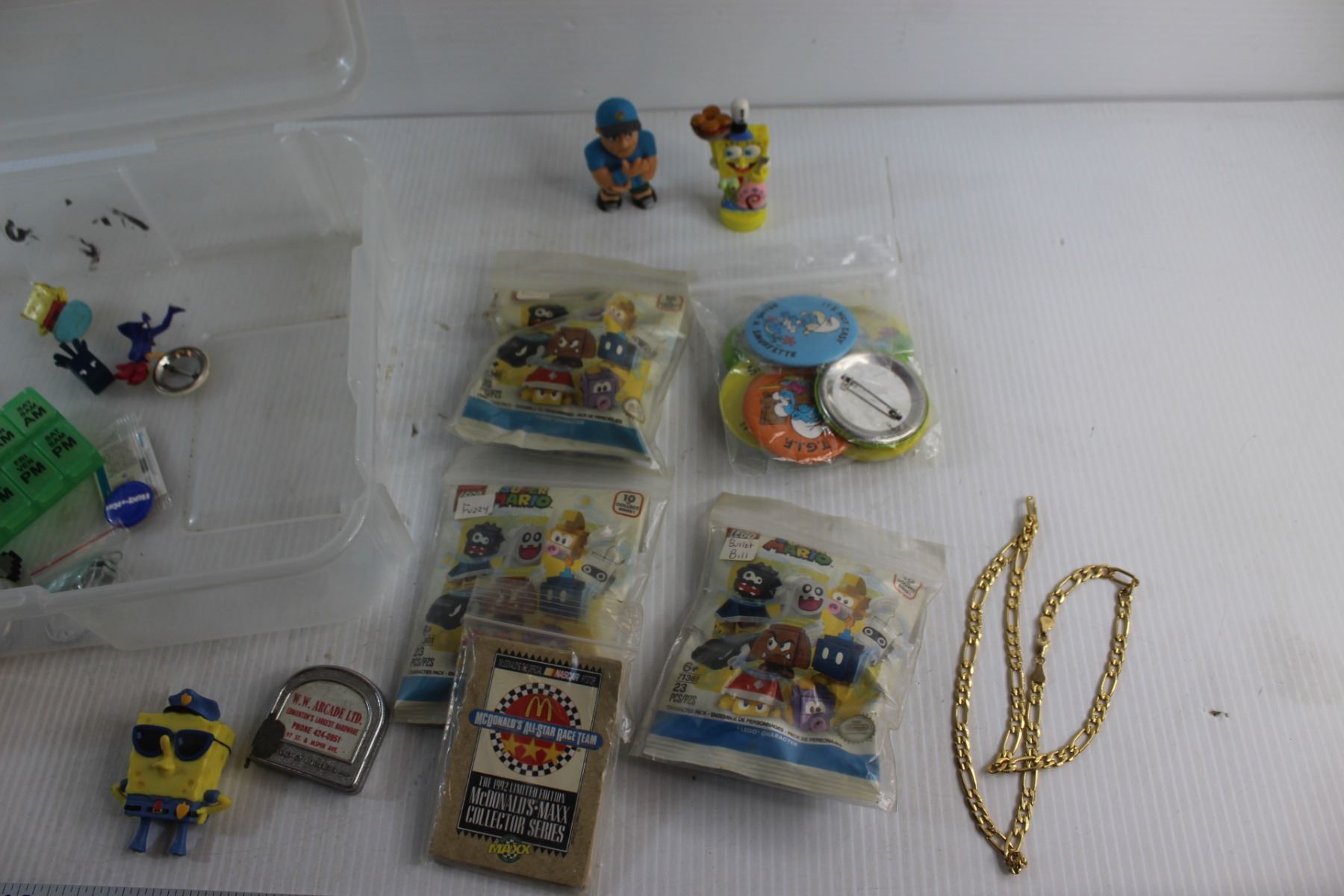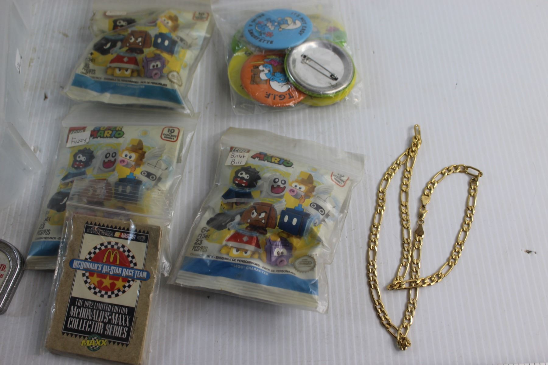 Necklace, Pins, Collectible McDonalds Cards & Lego Super Mario Figurines and Assorted Items