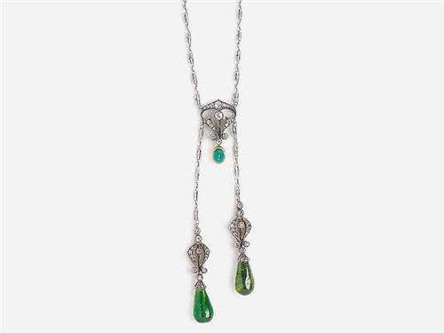 Platinum fancy links, 14 K gold and silver, 2 different size pendants, 47 different size tiny brilliants circa 1.0 ct, 1 tourmaline and 1 emerald decoration, circa 1920, later marked, gross weight: 14.8 g, length: 44 cm.