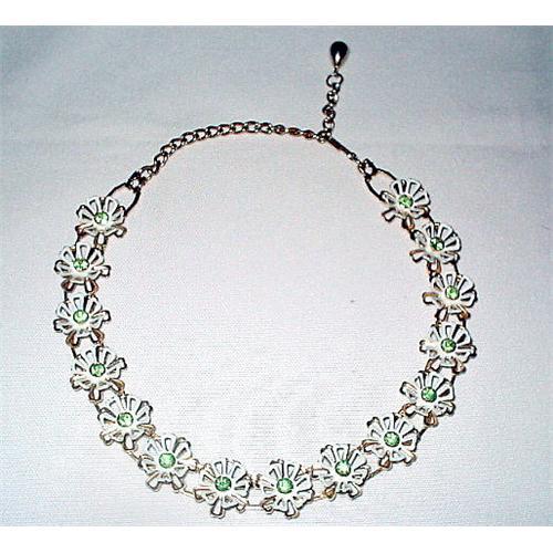A really pretty double layered pale green rhinestone and white enamel necklace with the bottom layer of the flowers in goldtone. The flower petals are all openwork, the necklace lays nice and flat around the neckline with the fifteen little flowers raised in a double layered style detailed with a sparkling pale green rhinestone at the center. The necklace measures 16" inches, including the extender and is adaptable to a choker or a necklace, very dimensional and extremely pretty. Excellent condition - you will absolutely love this necklace and so perfect for the coming Spring/Summer months.