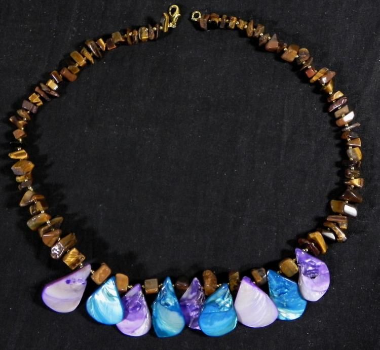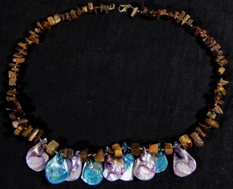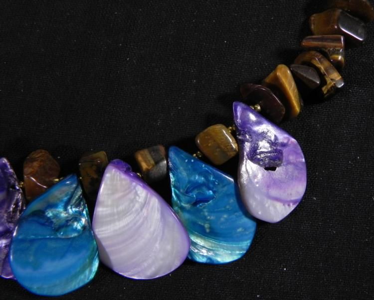 This necklace is comprised of many smooth tigers eye stones, and decorated with pieces of oyster shells tinted blue and purple. It has a lobster claw clasp. The size is 19 inches. Its condition is excellent. It has a natural beauty and a subtle, colorful look.