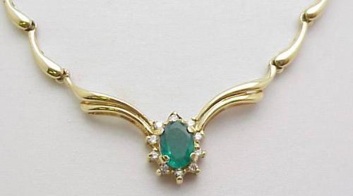 Necklace with 7x5 oval emerald surround by small diamonds attached to a 14kt yellow gold chain 18" 14.8gr