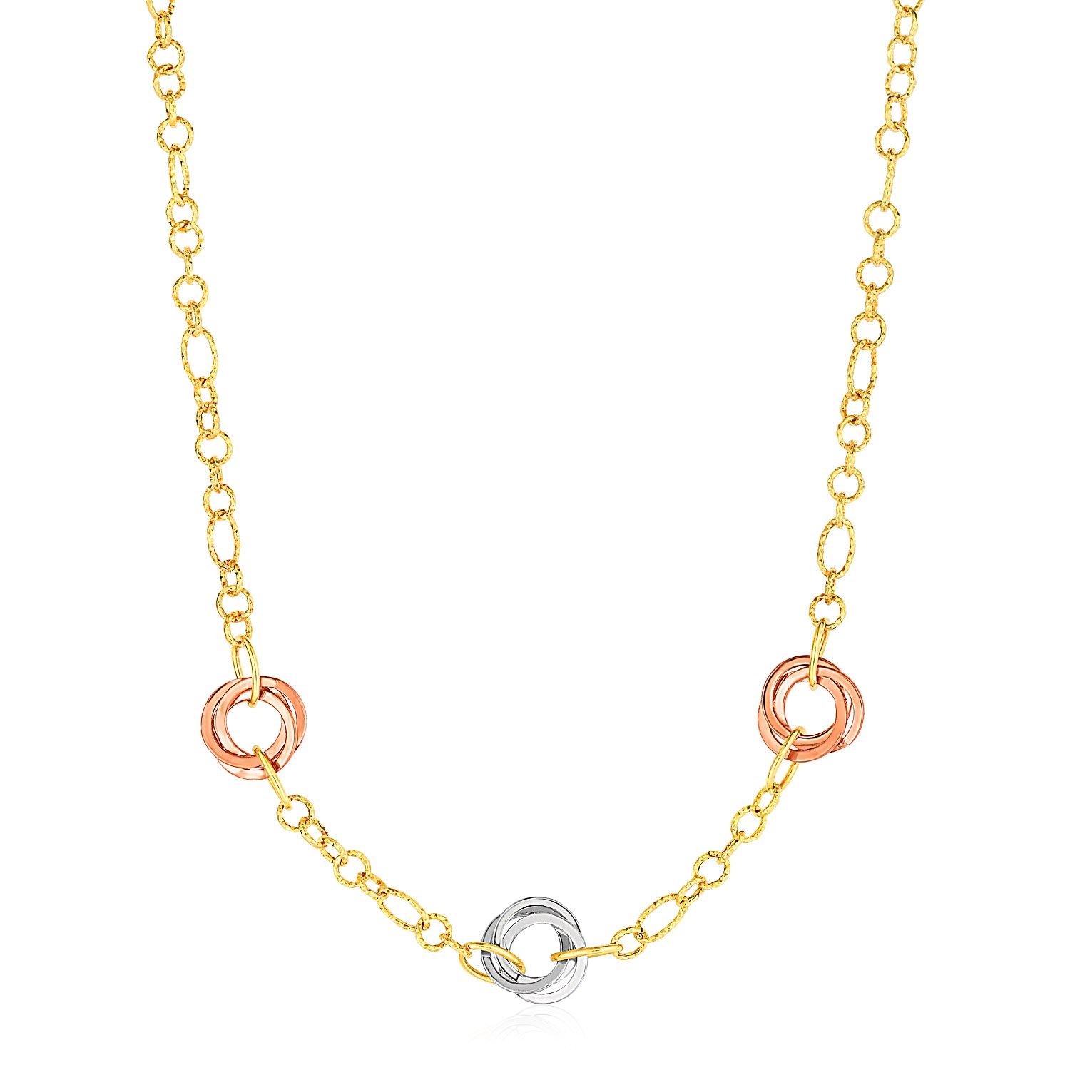 This unique necklace is highlighted by three rosette-like interlocking ring elements in yellow, white and rose gold. Necklace is 18'' long.