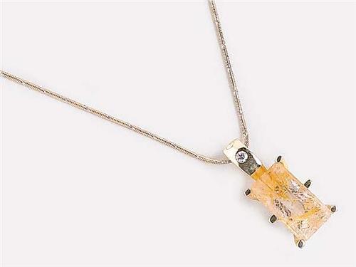 14 K gold, thin snake form chain, angular form cut quartz with rutile pin and 1 brilliant 0.05 ct (MCrP1), marked, weight: 10.6 g, in excellent condition.